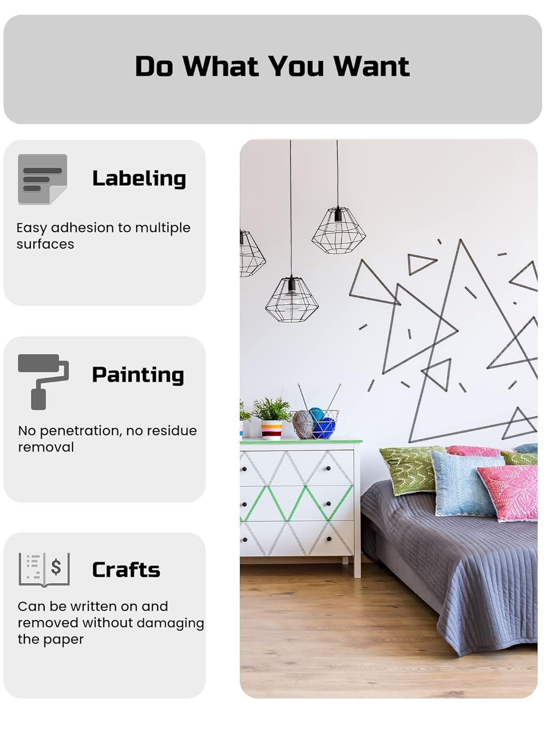 - Wide Applications: Painters tape can be used on almost all surfaces, without leaving any residue, thanks to its natural fiber construction. Great for wall painting, decorating, crafts, labeling and more DIY projects