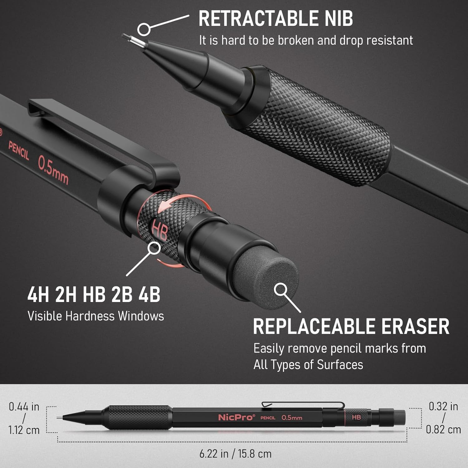 Nicpro Metal Mechanical Pencil Set, 3PCS Art Drafting Pencil 0.5, 0.7, 0.9MM & 2PCS 2MM Mechanical Drawing Pencils with 126 Lead(4B 2B HB 2H 4H Color) Weatherproof Barrel for Writing Sketching Drawing