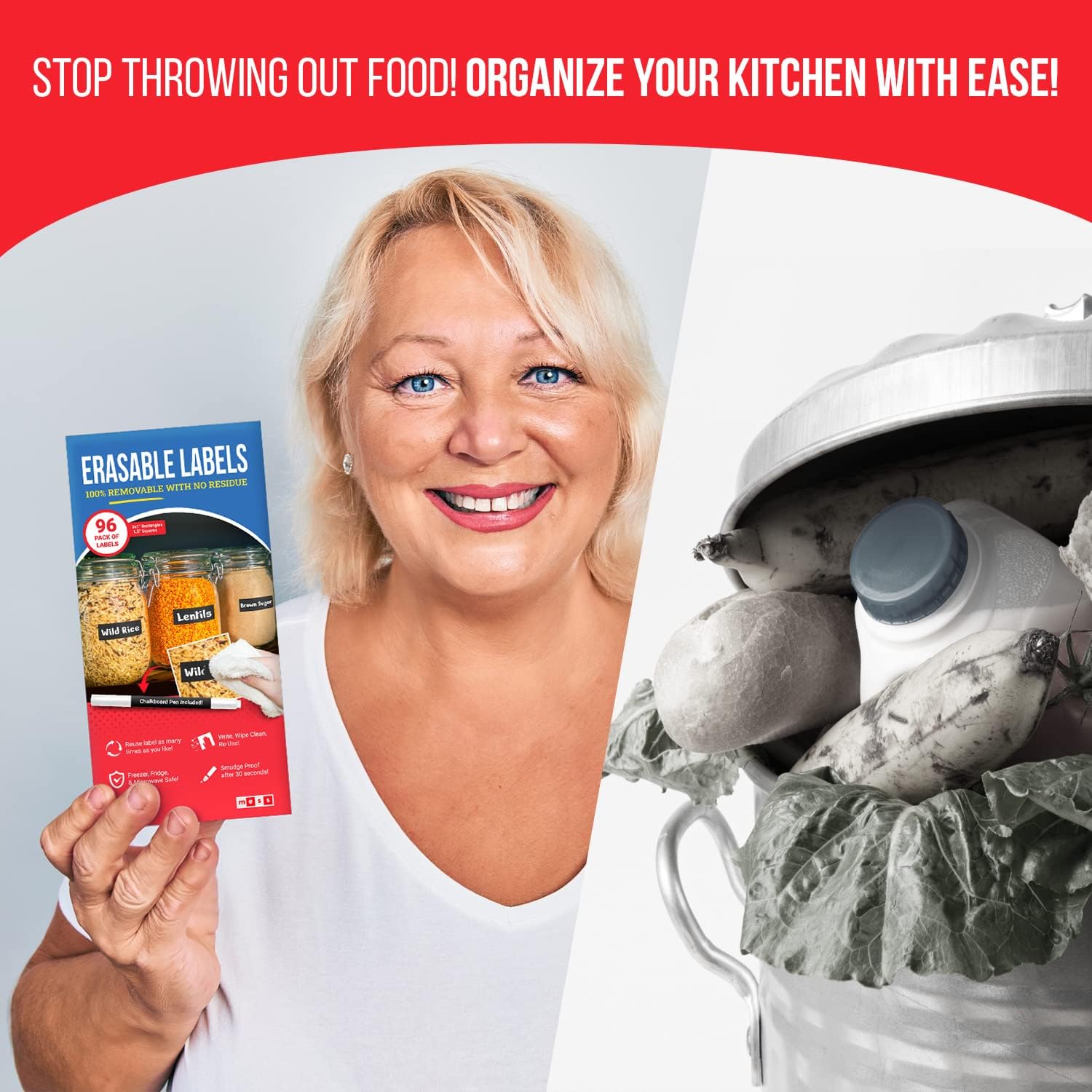 - Multipurpose – Your erasable and removable blank stickers work great for labeling meal prep containers, canning labels, mason jar labels, or organization in the fridge. Way better than freezer tape! Eraser and Marker not included. Help the Environment – Accurate labeling helps keep old fridge food, drinks, and containers out of the landfill. These kitchen labels for containers also keep harmful cleaners out of the drain!