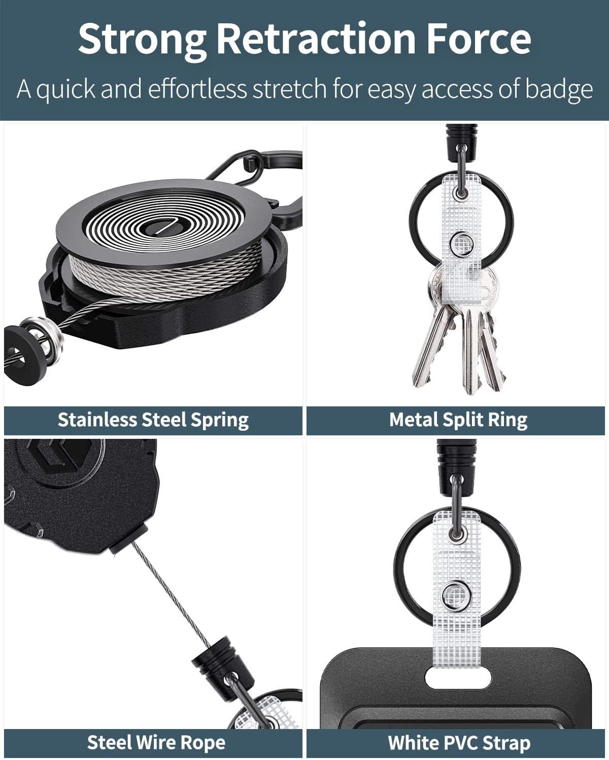 - Retractable Keychain: With built-in stainless steel spring coils, it has strong retraction force to endure pulls over 10,000 times and hold up to 8 oz. The 1 mm steel wire rope can stretch up to 31.5". Easy to open the door without removing the badge or key.
