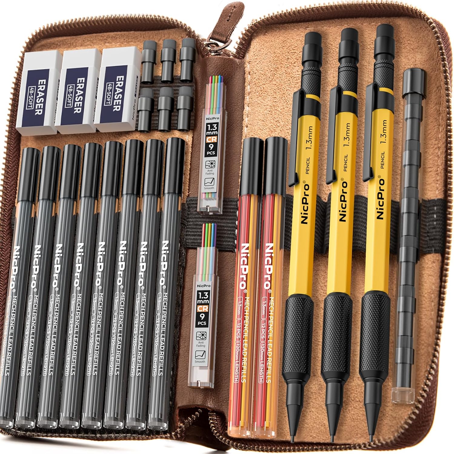 - Awesome Artist Pencil Set:Nicpro drawing mechanical pencil set comes with 3 premium 1.3mm mechanical pencils, 8 tubes of 120mm black resin leads (12 leads/tube), 2 tubes of red & yellow leads, 2 tubes of 9-color leads, 3 soft 4B erasers, 12 eraser refills, and a genuine leather pencil case—everything packed for sketching, drafting, and daily writing.