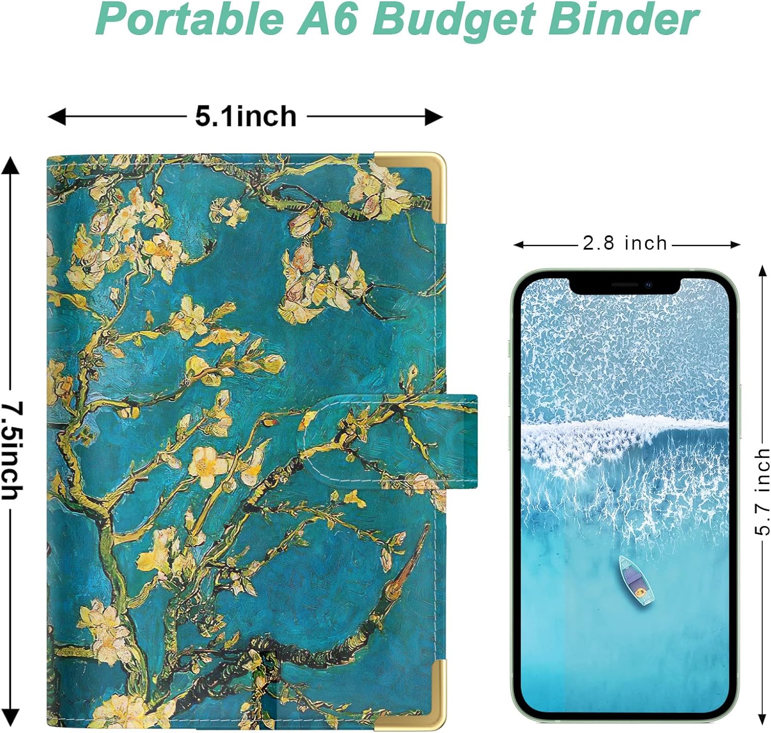 - Practical A6 Money Binder: Cash envelopes binder measures about 7.5 x 5.1 inches. Made from water-resistant PU leather, designed with attractive illustration and gold metal trim that protect corners from wear, balance between aesthetics and utility