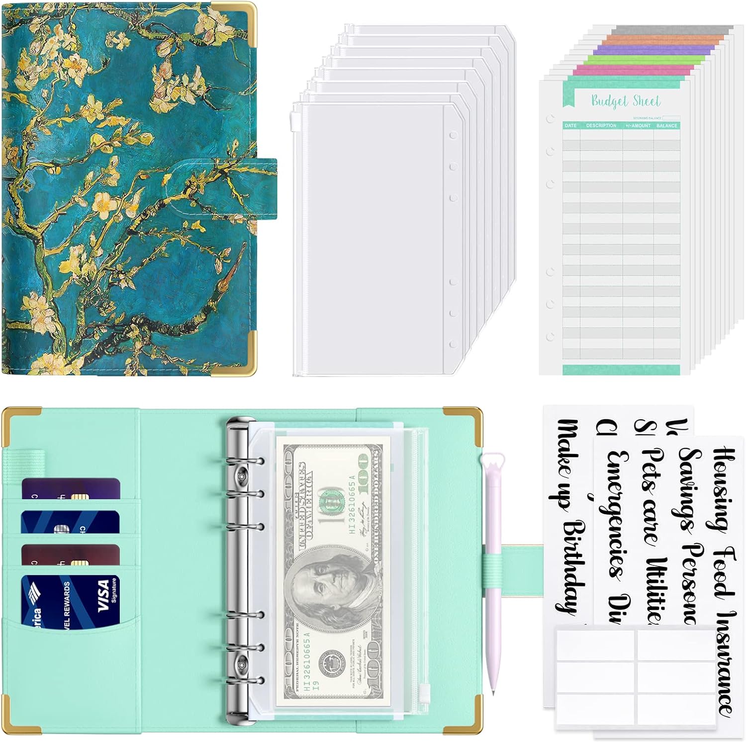 - Cute Budget Binder Set: This money organizer for cash includes a a6 binder cover, 8pcs pvc cash envelopes, 1 self-adhesive label, 12pcs budget sheets and 2 sheets sticker labels composed of 22 words