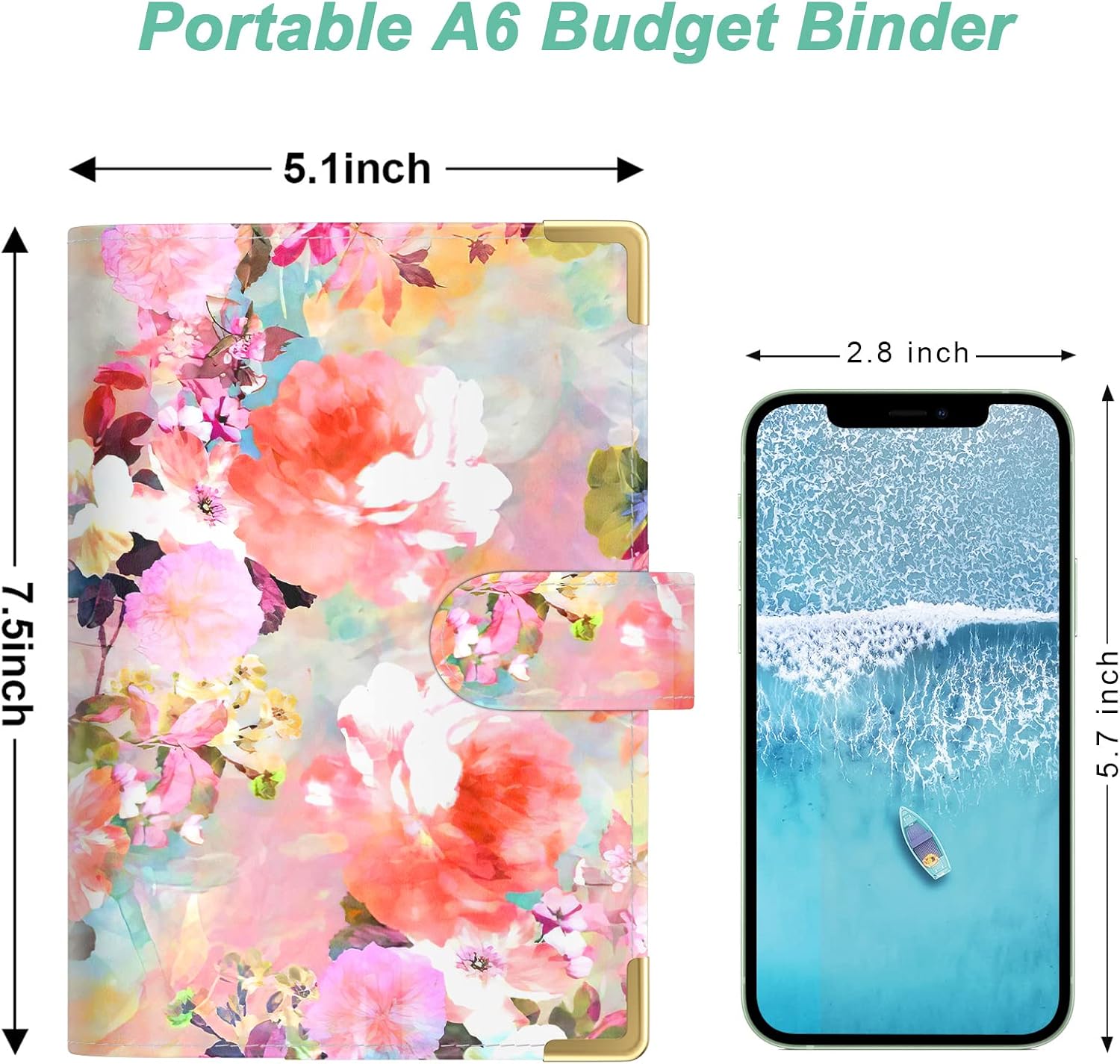 Rnivvi Budget Binder with Zipper Envelopes, A6 Money Saving Binder Cash Envelopes for Budgeting, PU Leather Planner Money Organizer for Cash Bills, Cute Floral System Wallet for Women, Pink Flower