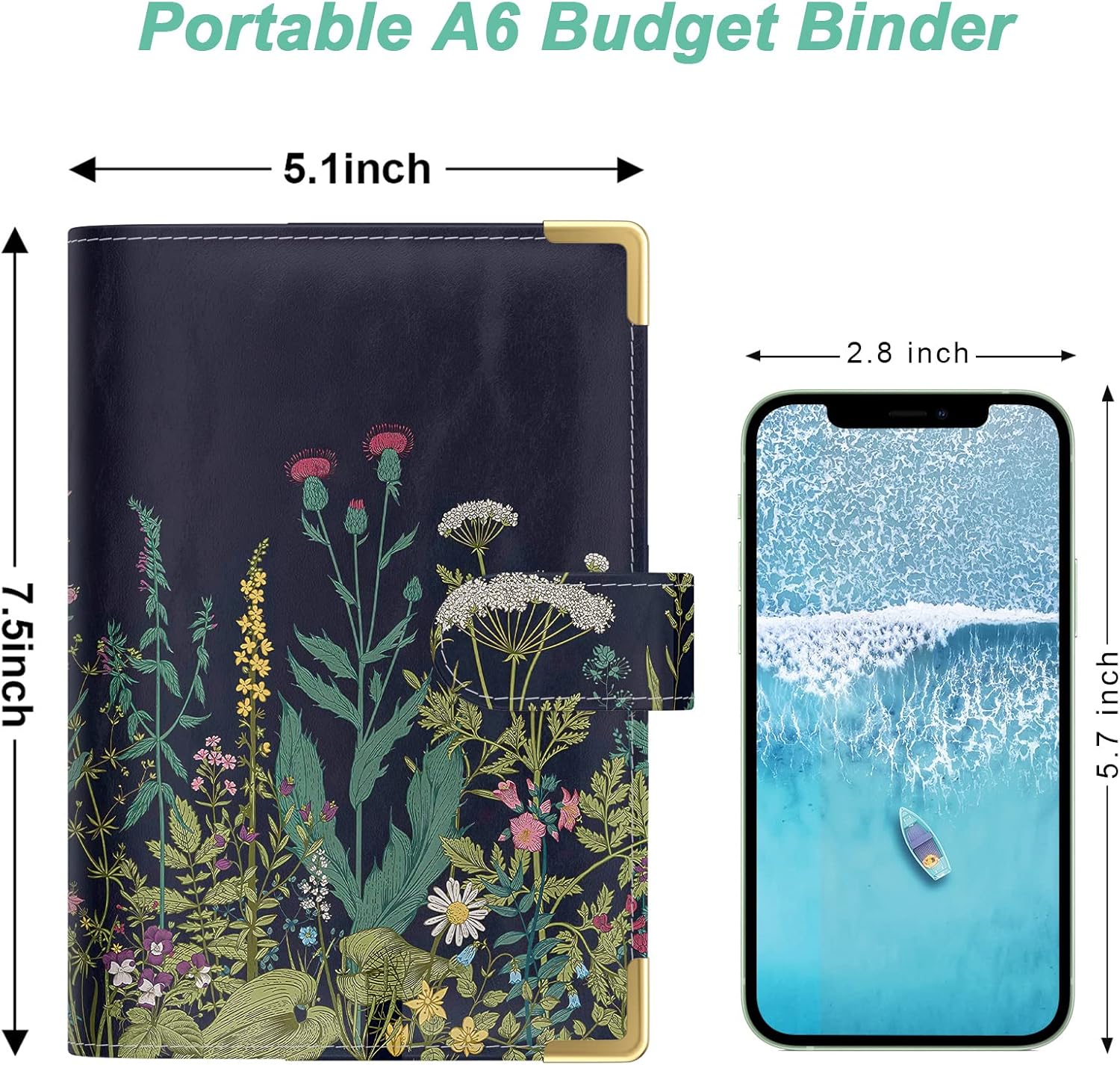 - Practical A6 Money Binder: Cash envelopes binder measures about 7.5 x 5.1 inches. Made from water-resistant PU leather, designed with attractive illustration and gold metal trim that protect corners from wear, balance between aesthetics and utility