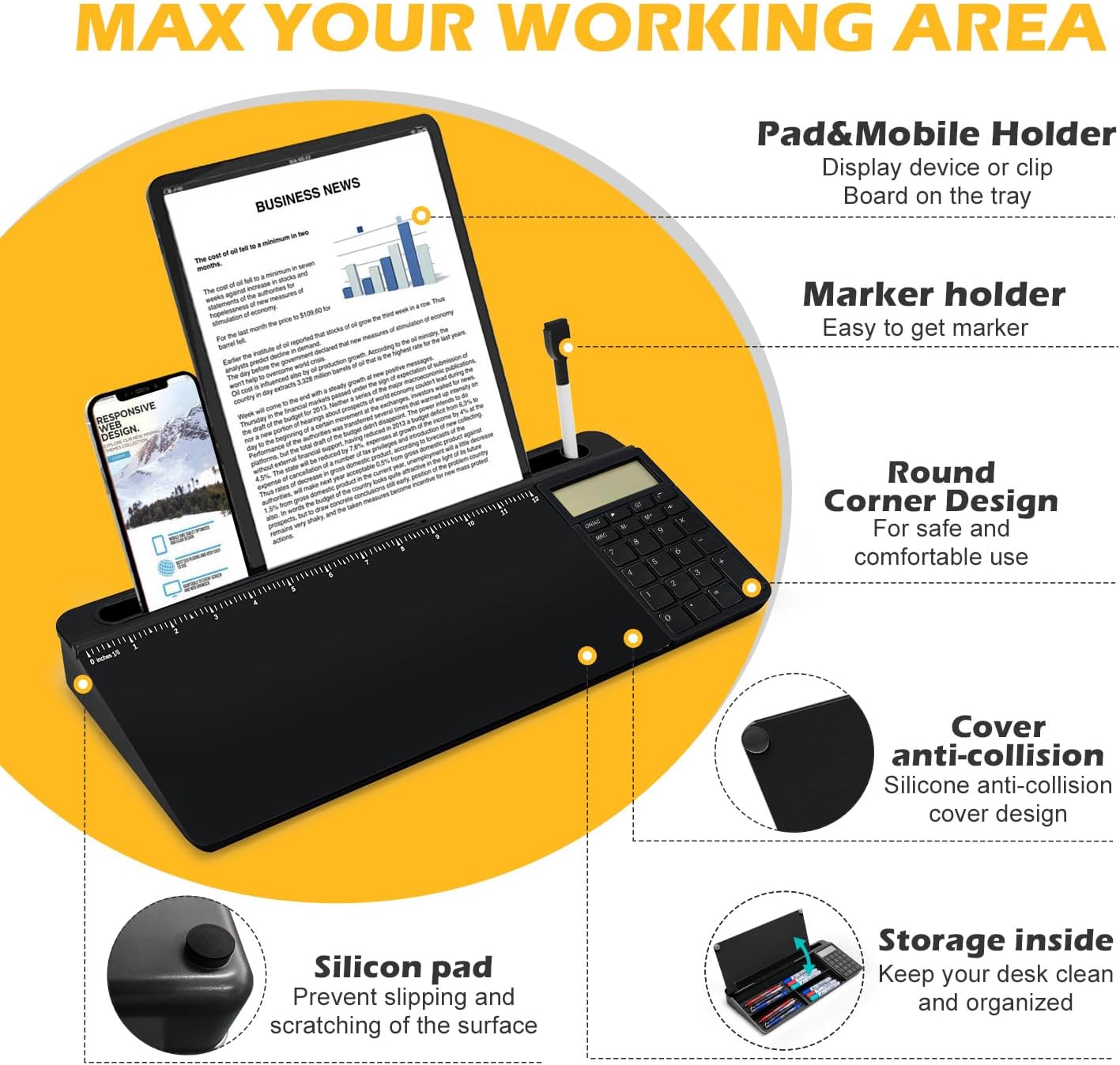 - ✅【MULTIFUNCTIONAL DESKTOP BOARD】:Our modern desktop gadget combines writing, organizer, built-in mirror, calculation and ruler as one, which can be used as a notepad, desktop organizer, calculator, ipad/pen/cell phone holder or computer pad keyboard holder. Our desktop whiteboard is a multifunctional office partner that can meet all your office needs. Try it out!
