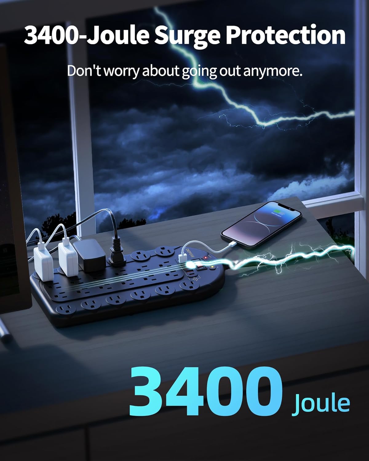 - 【Safeguard Your Devices】 It’s ETL listed. This power strip also boasts 3400J surge protection to shield your valuable electronics from power fluctuations and surges. This surge protector power strip ensures safety and versatility, good for home, office, or gaming room.
