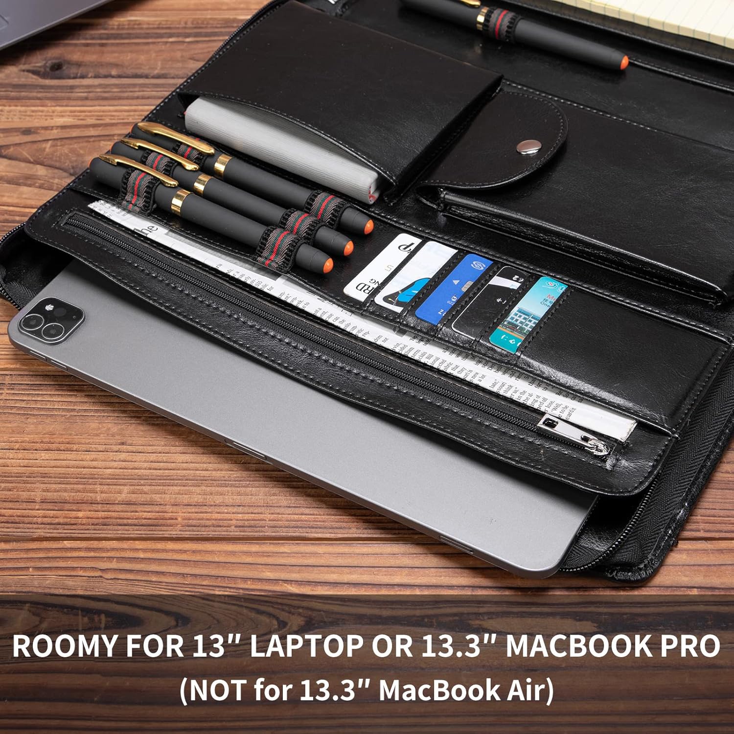 - Handy Exterior Pocket: Read your resume or organize your files quickly and easily without opening the leather portfolio when in need. Roomy enough to fit a 13” laptop or 13.3” MacBook Pro (Not for 13.3” MacBook Air). Alternatively, you can also store the laptop or tablet inside the leather portfolio.
