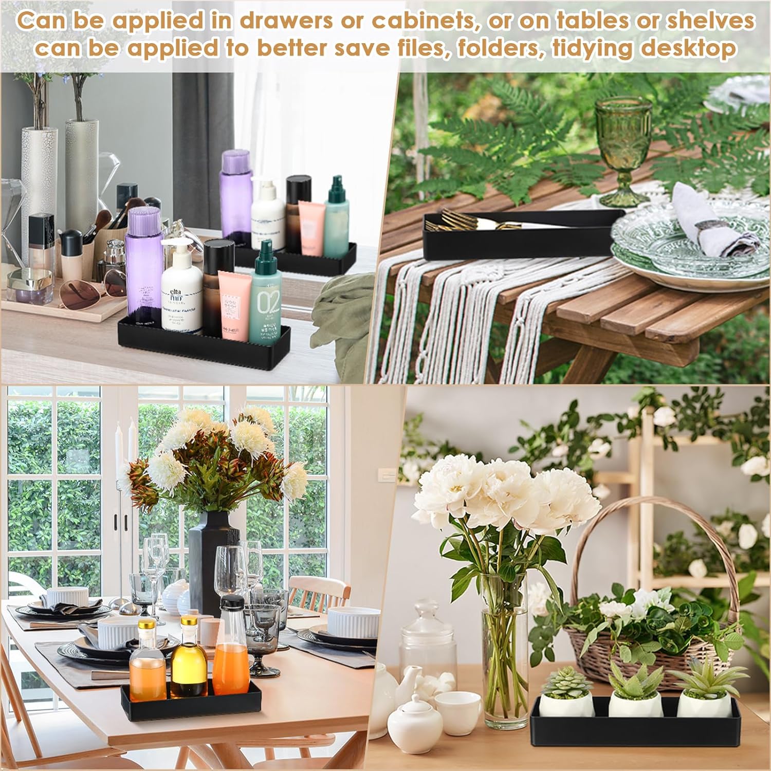 - Ideal Size: measuring about 9.45 x 2.95 x 1.38 inches/ 24 x 7.5 x 3.5 cm, each black tray has a suitable size to hold various stuffs, can effectively helping you organize your desktop and drawer, to keep your things in order