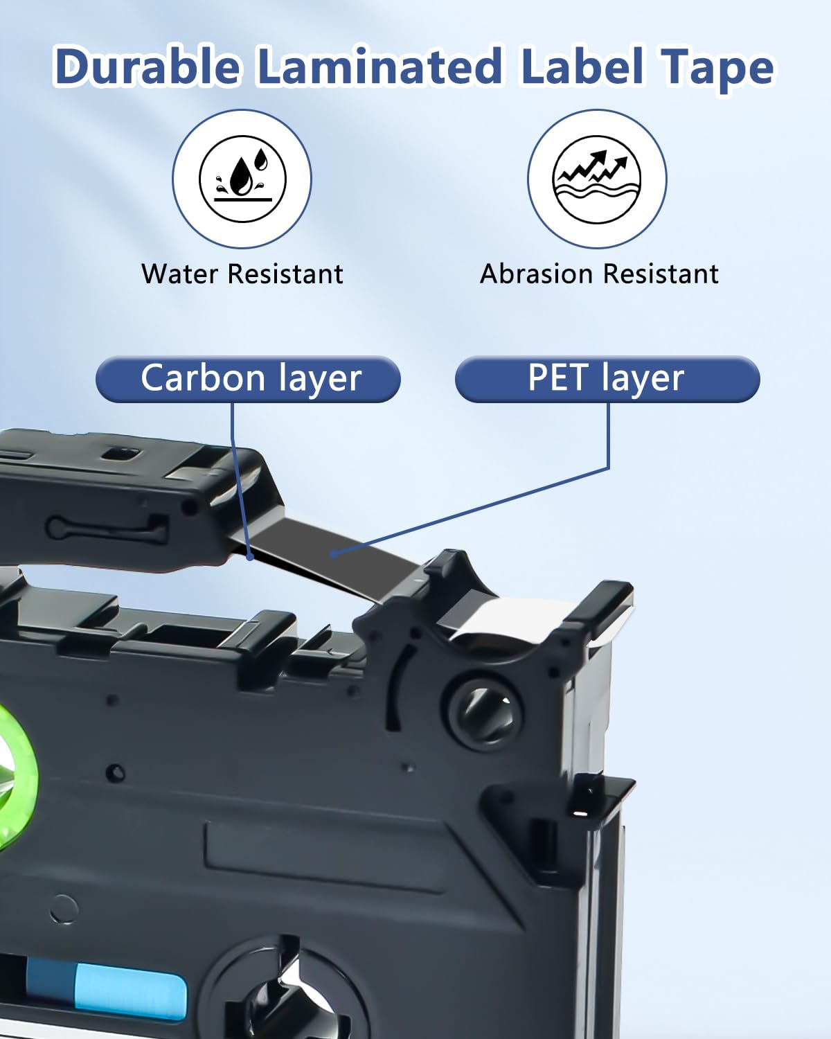 - Features: The laminated layers of label tape make it fade-resistant, Tear resistant Water Resistant and Chemical Resistant. Strong adhesive ensures the label stays in place and does not peel off over time.