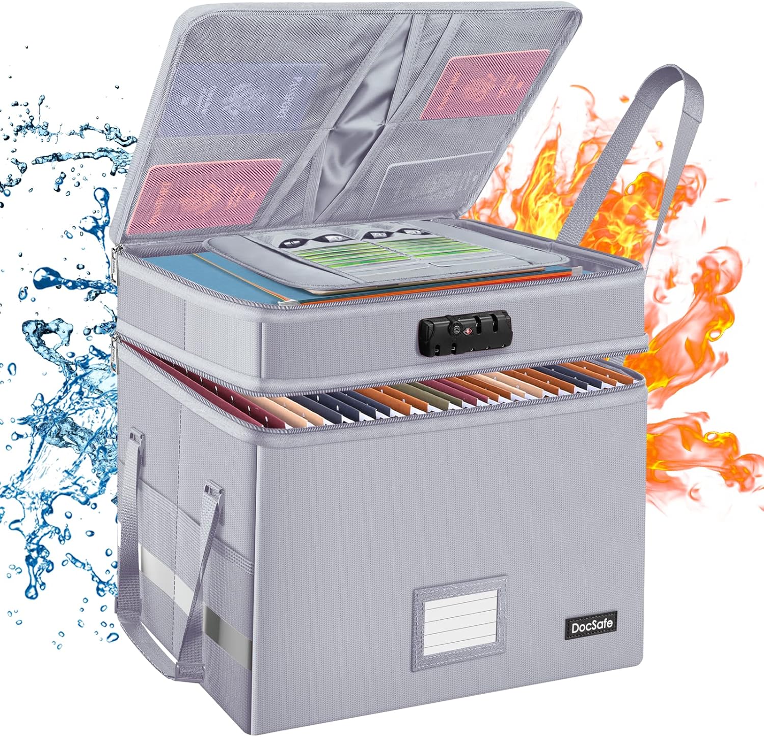 DocSafe File Box with Lock,Multi-Layer Fireproof Document Box Collapsible File Storage Organizer with Pocket,Large Portable Home Office Filing Cabinet Safe for Hanging Letter/Legal Size Folder,Silver
