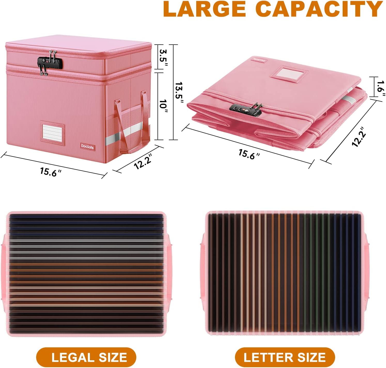 DocSafe File Box with Lock,Multi-Layer Fireproof Document Box Collapsible File Storage Organizer with Pockets/Handle,Large Portable Home Office Filing Safe for Hanging Letter/Legal Size Folders,Pink