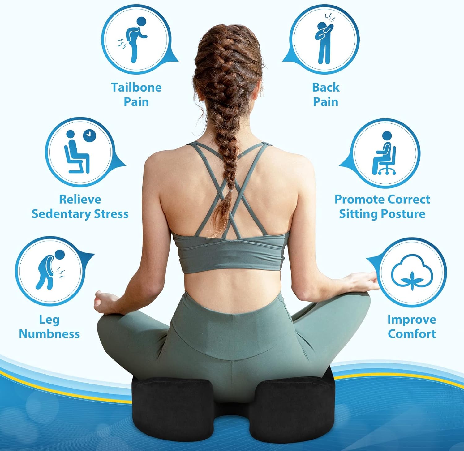 - [Tailbone Pain Relief] The seat cushion's unique cocked edge design provides adequate support for the legs and hips, effectively reducing sciatica, tailbone, back pain, leg numbness and hip pain. In addition, this thick chair cushion also helps to improve posture and relieve sedentary fatigue.