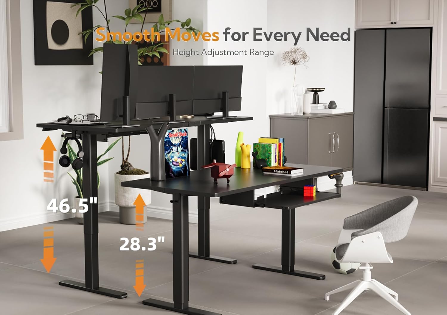 - Smooth Electric Height Adjustment: Eletric standing desk features a robust motor, allowing you to effortlessly adjust the height from 28.3 inches to 46.5 inches (including the 2.36-inch desktop thickness). With four programmable height presets, you can easily find your preferred height for maximum comfort and convenience.