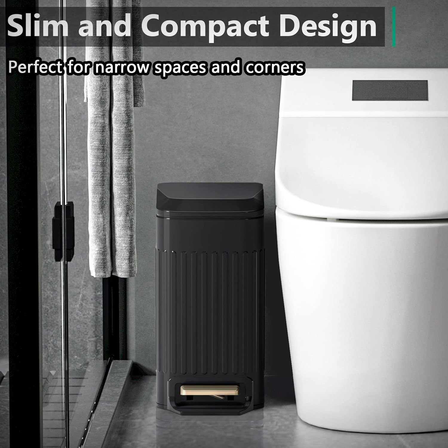 Small Bathroom Trash Can with Lid Soft Close-6L/1.6 Gal Slim Step Garbage Can-Metal Pedal Wastebasket-Narrow Rectangle Garbage Container Bin for Corner Office, Bedroom, Toilet, Live Room-Black