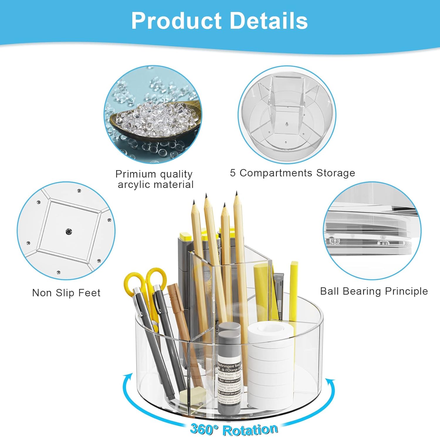 - 【360 DEGREE SPINNING DESIGN】 Featuring a 360°rotating design with a handy handle, this desktop organizer can be turned smoothly to get to each compartment and organize your items by type. Keeps everything neatly organized and at your fingertips