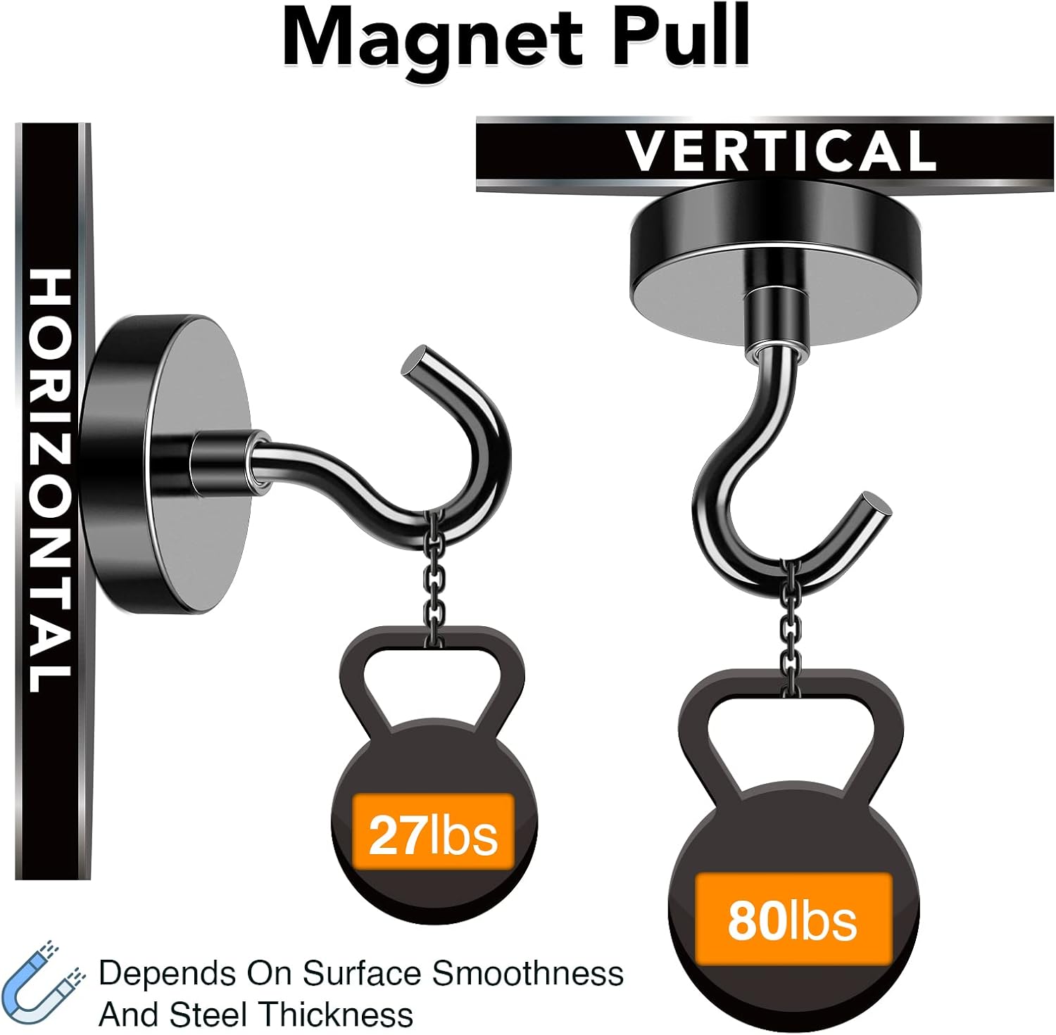 - 【Powerful Magnet with Hooks】- The black magnetic hooks are made of neodymium magnet, the powerful magnetic force is only concentrated at the bottom of the hooks, which can offer nearly 80lbs pulling force on horizontal application and the power reduced by 2/3 in the vertical direction.
