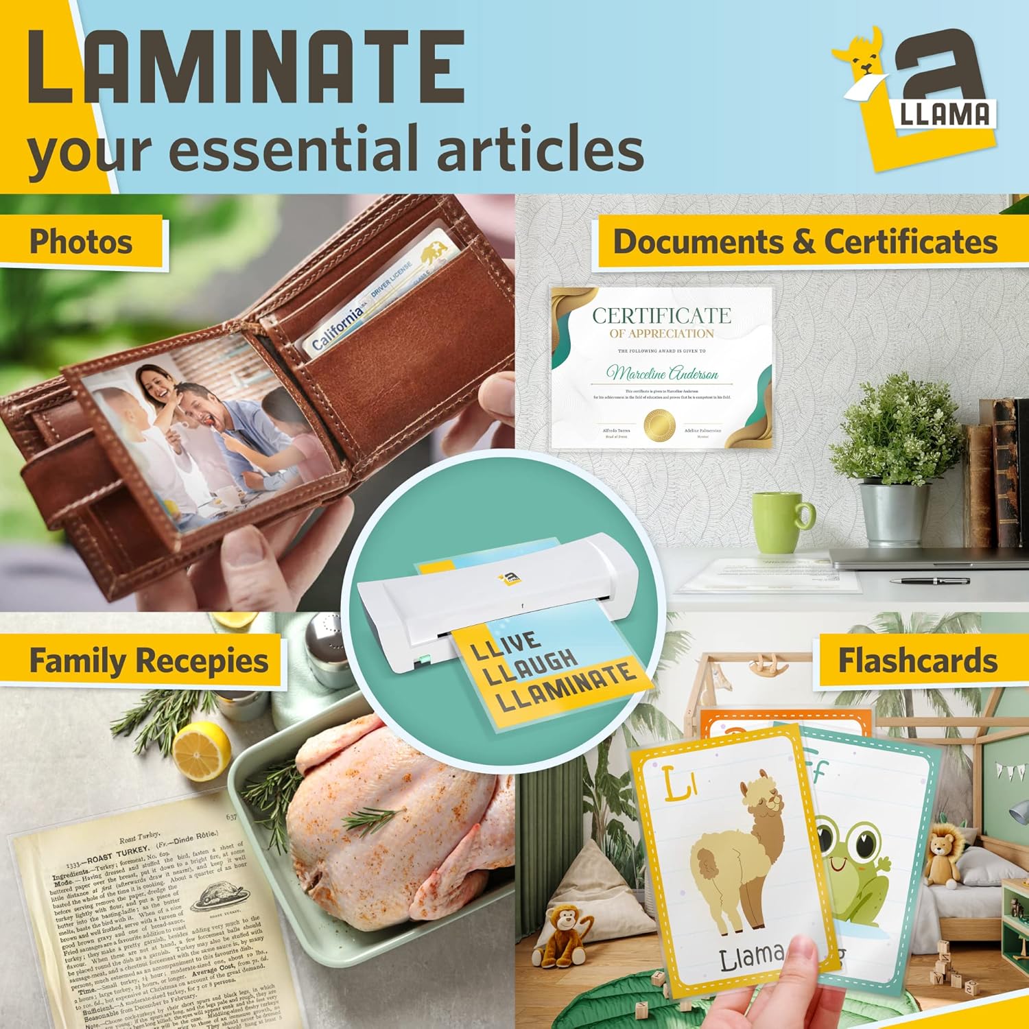 - 🦙 BONUS FOLDABLE SCISSORS: Conveniently trim thermal laminating pouches to fit various sizes, such as laminating sheets 8.5x11, 8.9 x 11.4, 5 x 7, 4 x 8, 4 x 6, and 3 x 5 inch papers; appropriate to laminate paper, teacher classroom supplies, business cards, sticker labels, pictures, and any other important documents that require safeguarding