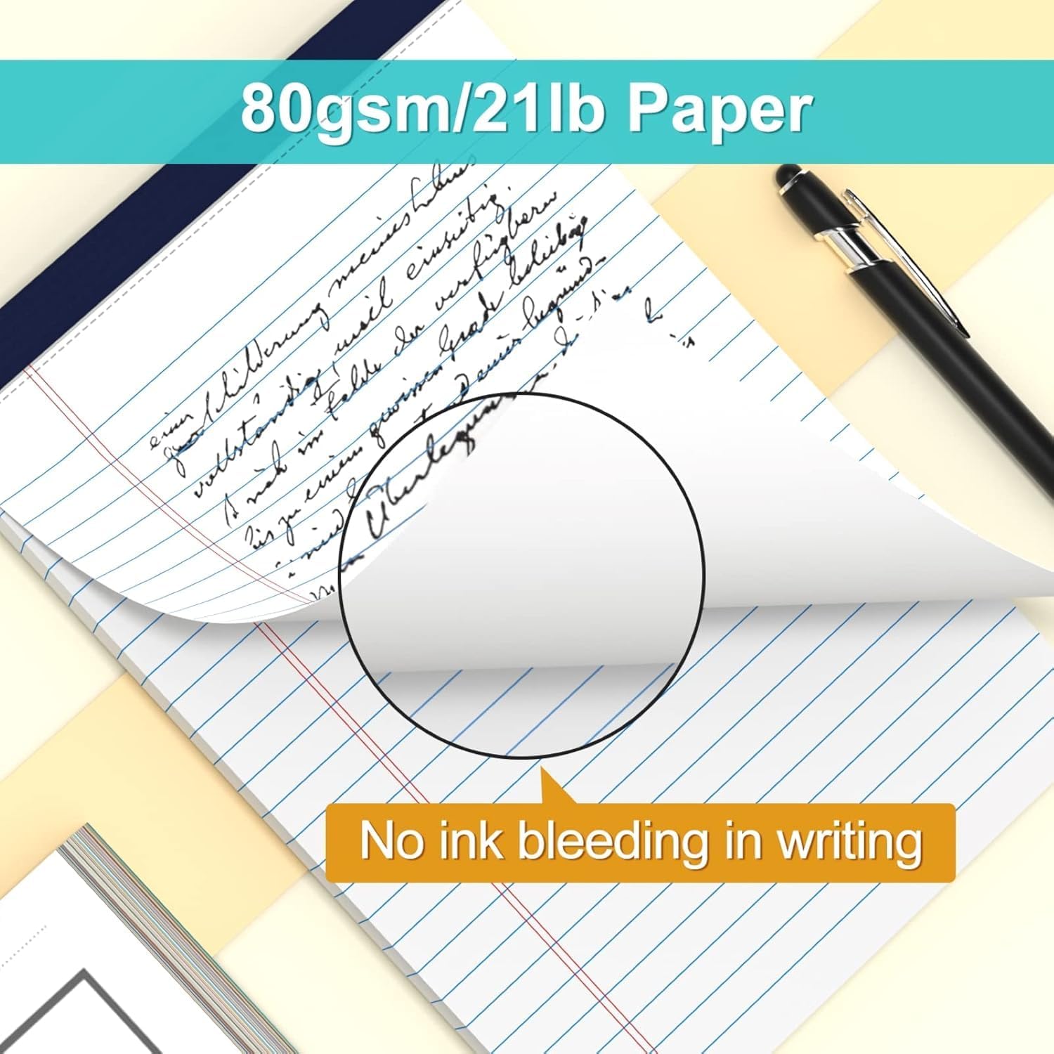 - [Excellent Writing Experience] Rediscover the joy of writing with our note pads. The medium ruled offers ample space for your notes, while the smooth, premium-weight 80gsm/21lb paper ensures your ballpoints and ink gel pens glide effortlessly across the page. Our college ruled legal pads prevent ink bleeding and show-through, ensuring your writing stays visible and on the surface. Our note paper pads are thicker than average, reducing ghosting and ensuring a smooth writing experience.