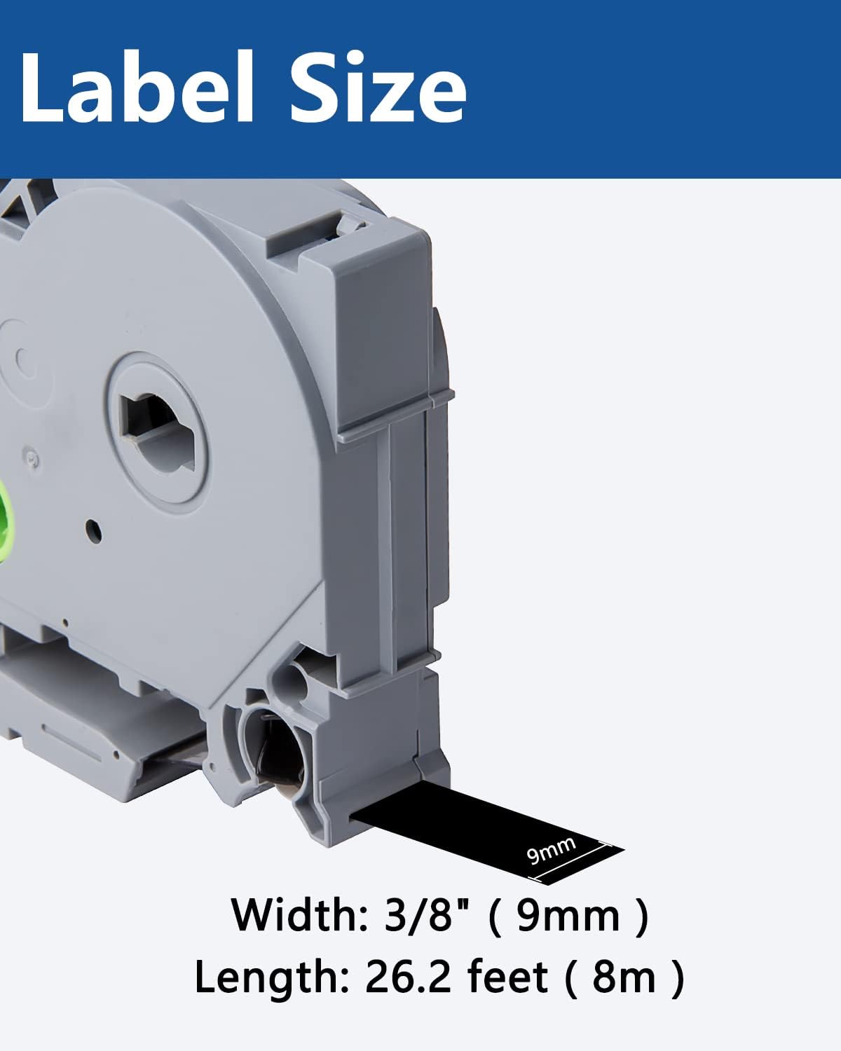 - Size - 3/8" width x 26.2' length ( 9mm x 8m ) each 9mm label maker tape. Color - White ink on black tape