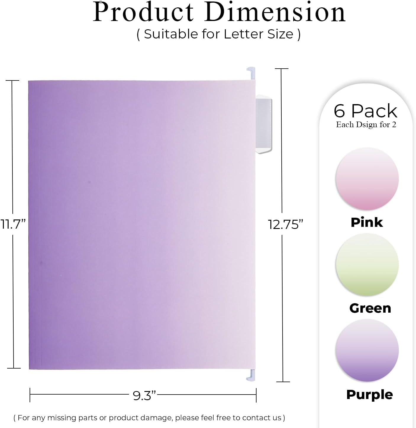 - Folder Dimension - Top metal bar's length is 12.75”, file folder size is 11.7" W x 9.3" H. You will receive 6 Gradient folders(Pink x 2, Purple x 2, Green x 2) + 6 customized plastic tabs. For further problem, please feel free to contact us