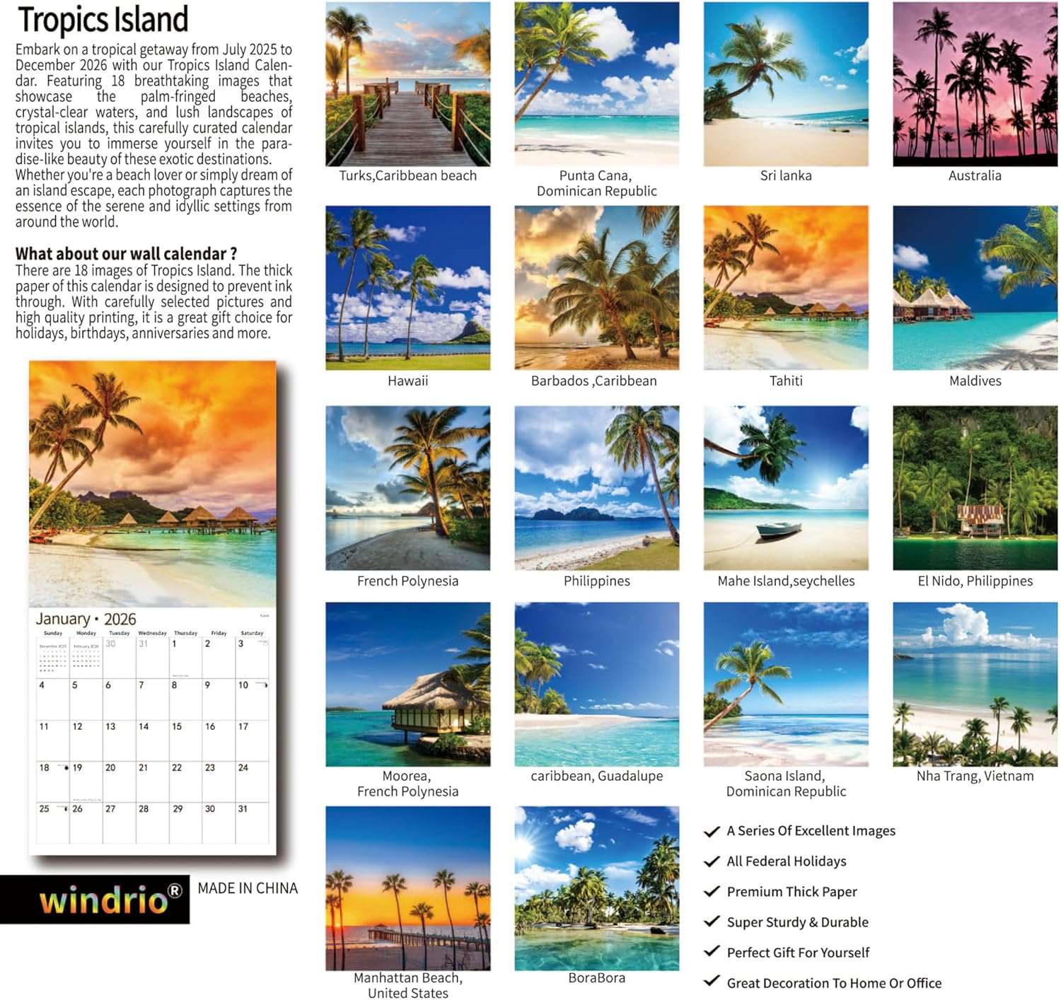 - WONDERFUL PHOTOGRAPHY OF TROPICS ISLAND : This July 2025 - December 2026 wall calendar filled with high resolution, professionally captured images. Please enjoy the world's most stunning Islands every day, white sands and crystal blue waters, brings visual pleasure and excitement. These pictures from dazzling Islands, unspoiled nature. Wonderful photography to invigorate your day.