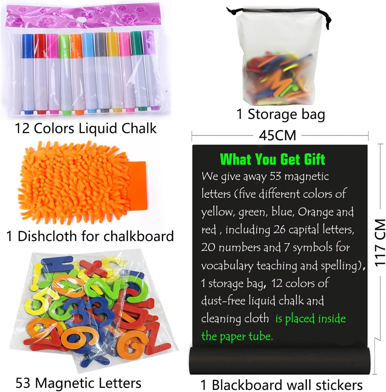 - 【Free Gifts Inside】It comes with a complete accessory set to make playtime and learning easier for kids: 36 magnetic letters for interactive spelling games, 1 convenient storage bag to keep everything organized, 12 vibrant colors of dust-free liquid chalk, and 1 cleaning cloth for quick, effortless wiping on blackboard stickers. With all these essentials included, it becomes the perfect magnetic chalkboard to spark your child’s creativity and learning fun!