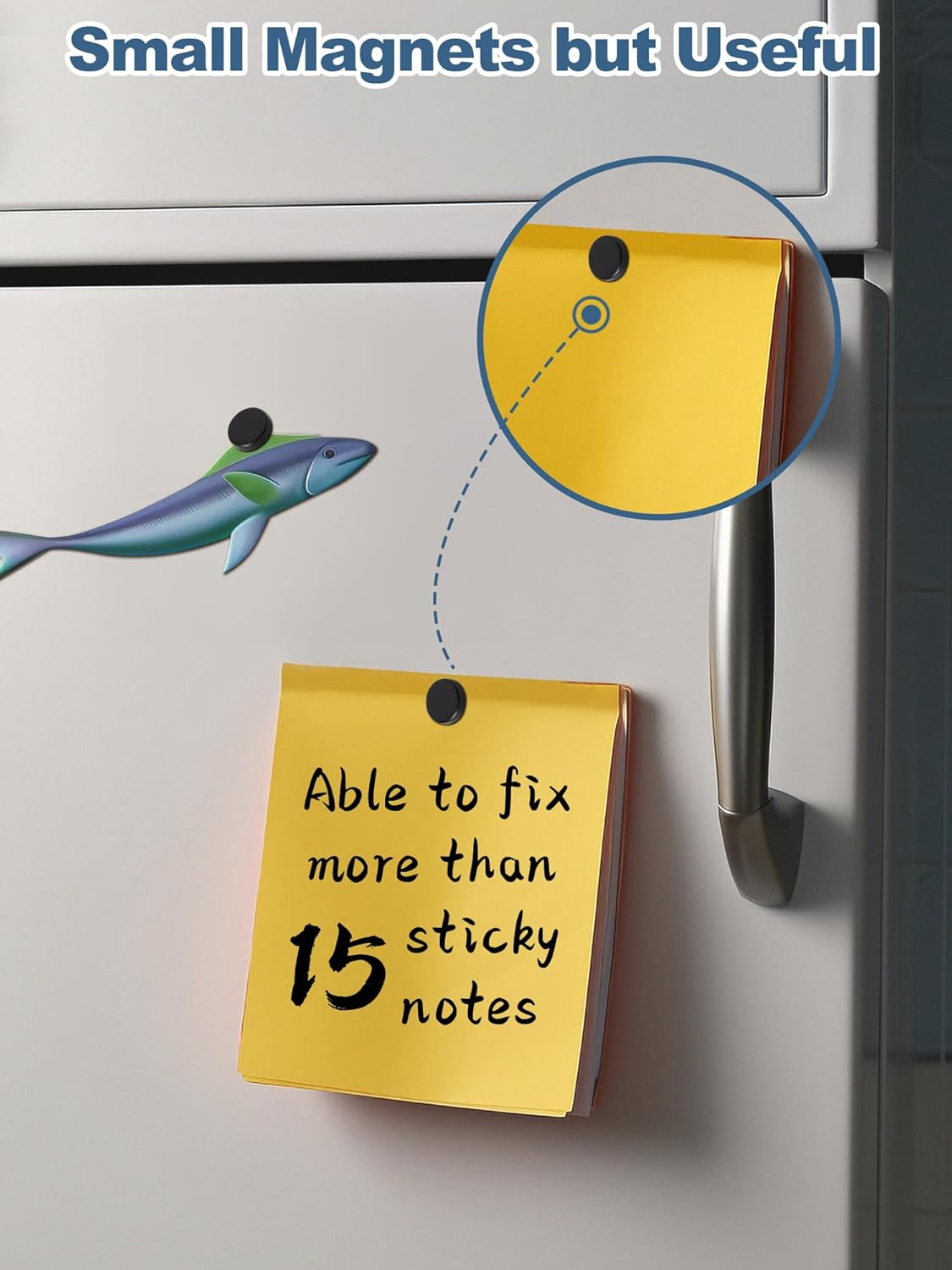 - Useful Design - Despite of its small size (Diameter: 10 mm, thickness: 2.3 mm), each magnet is able to hold at least 15pcs sticky notes. You don't have to worry it's not able to fixate the paper.