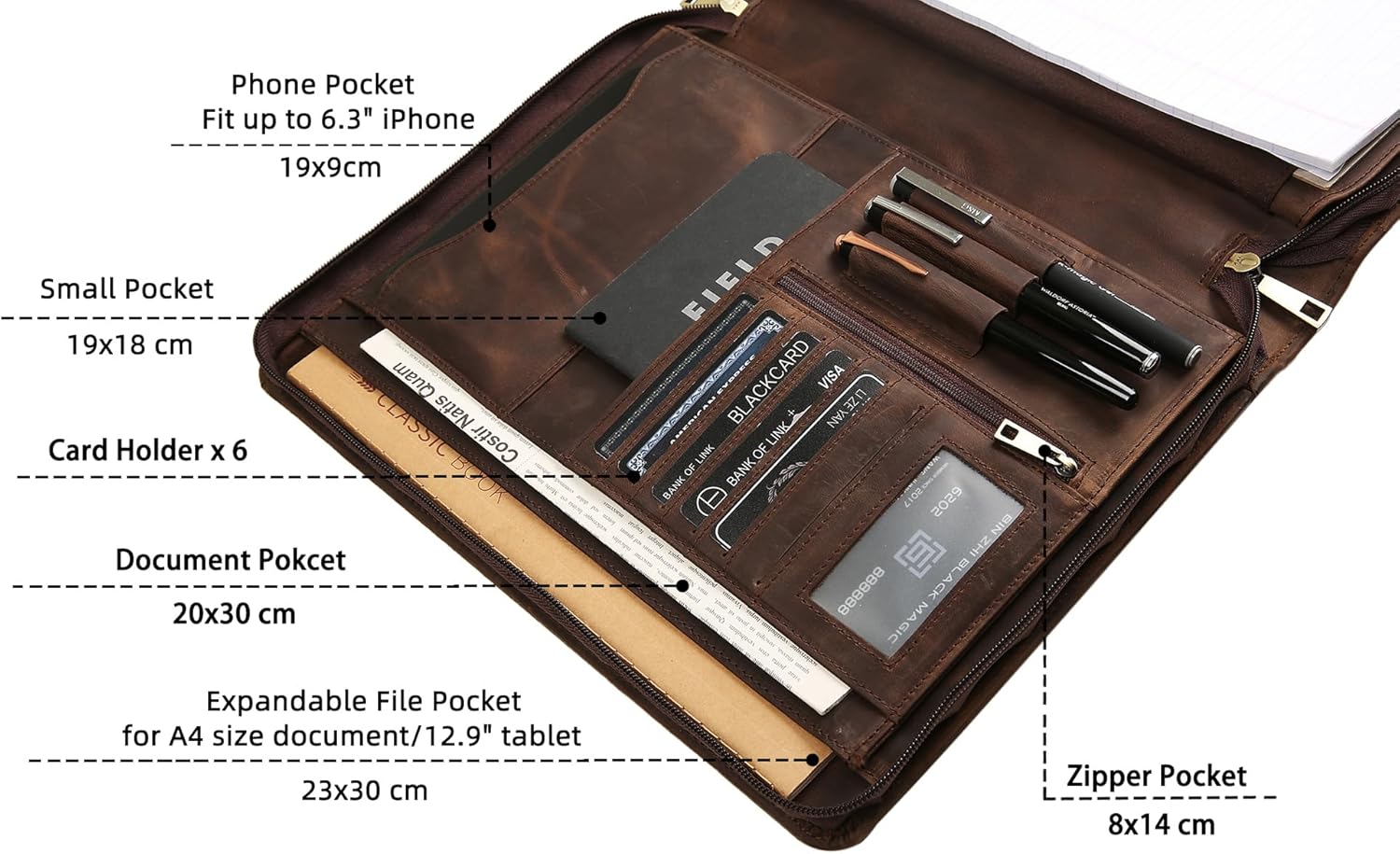 - This legal pad portfolio can neatly store your working items, you no longer need an extra briefcase. The business portfolio has 3 pockets for documents, 1 phone pocket for 6.5-inch iPhone, 1 zipper pocket for tickets, 6 card holders and 3 pen slots. The writing pad is for 11×8.5 letter size notepad.
