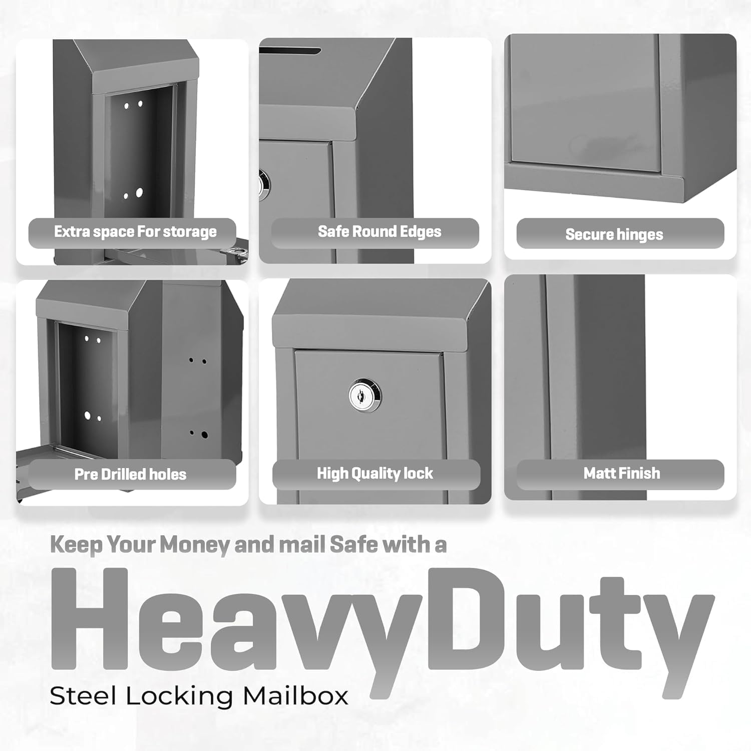Metal Donation Box-Suggestion Box with Slot and lock-Cash Lock box for Money-Waterproof Drop Box-Comment and ballot voting box-comes with pre-drilled holes for easy wall mounting 10 X 6 X 2.5"(Gray)