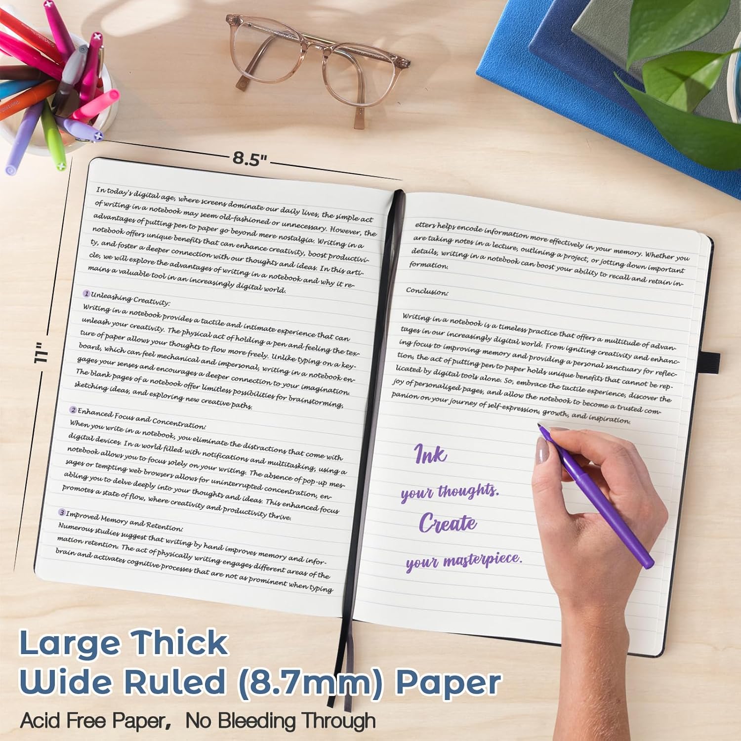 - Optimized Wide Ruled Notebook Journal: With the ideal college-ruled line spacing, lined journal accommodates detailed and organized writing to enhance productivity for students, professionals, or anyone in need of a neat writing space.