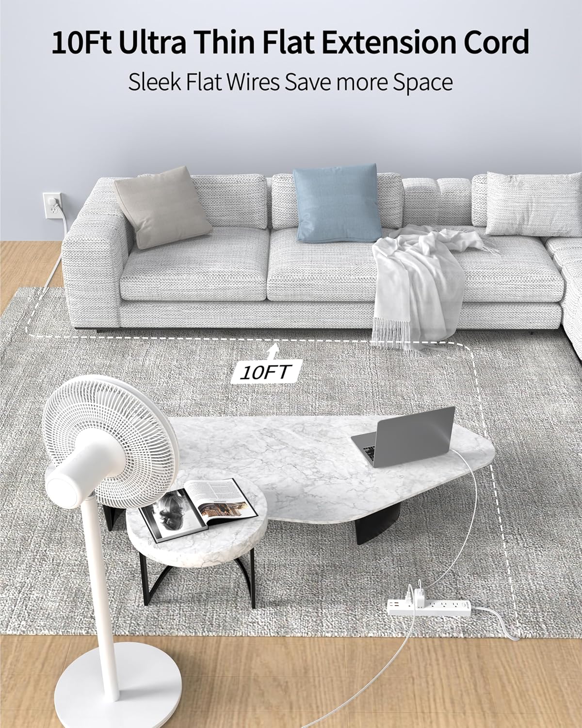 - 【Meet Your Need】-A 10-foot flat extension cord allows it easy to use in all sorts of different areas for plugging it in within the reach of your electrical product. You even can’t feel it under the carpet. So it's easy to run it under a rug or along walls without adding unsightly bulk or creating a trip hazard.