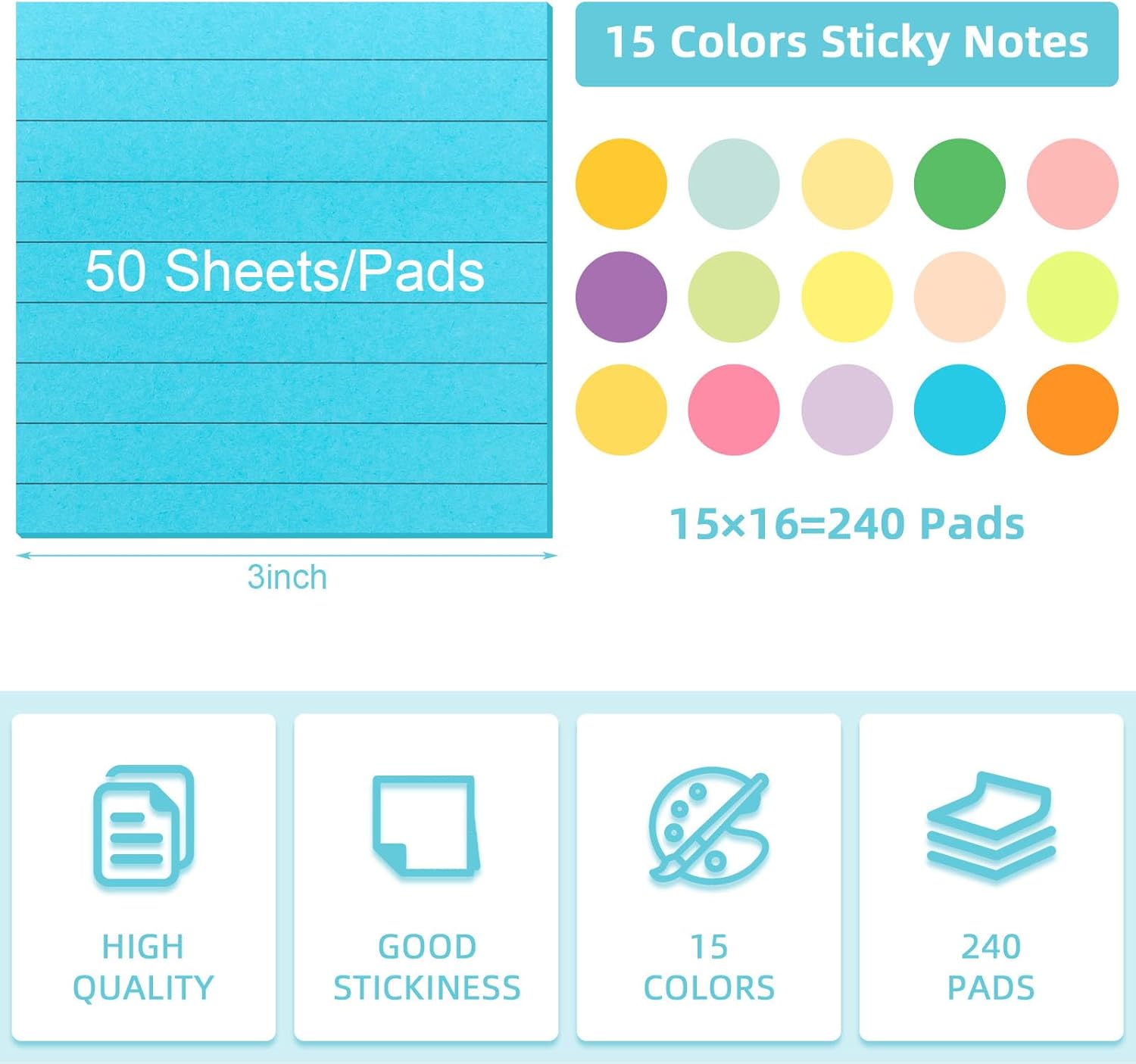 Seajan 240 Pads 3 x 3 Inch Sticky Notes Notepads Multi Bright Colors Self Sticky Pads for Students Teachers School Office Supply Desk Accessory 15 Colors, 50 Sheets Each(Neon,Line)
