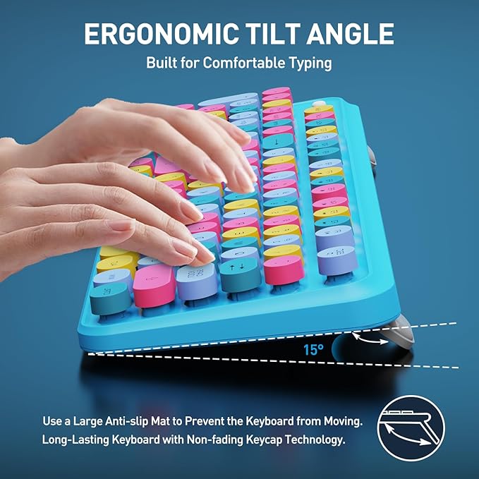 - A fusion of retro style and modern design: The inspiration of these cute rounded keys come from vintage typewriters offering you visual enjoyment and retro feeling to type. The mini Optical mouse is with modern ergonomic design,DPI adjustable(800-1200-1600).The combo will bring you a nostalgic feeling with the eye-catching retro aesthetic.