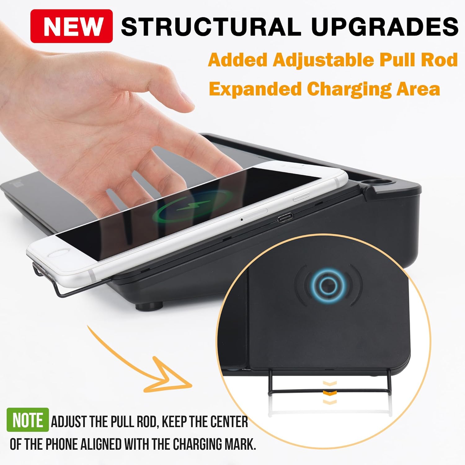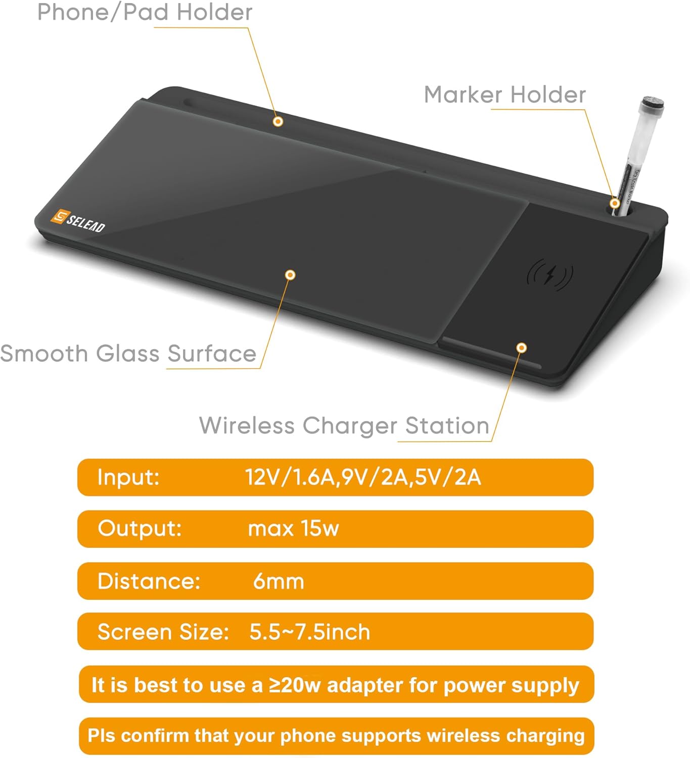 - 📳MULTIFUNCTIONAL: Storage, wireless charging, write, hold, keyboard stand,our desktop white board is an all in one multipurpose board. Equipped with black dry erase markers, eraser and 3ft USB Type C cable.