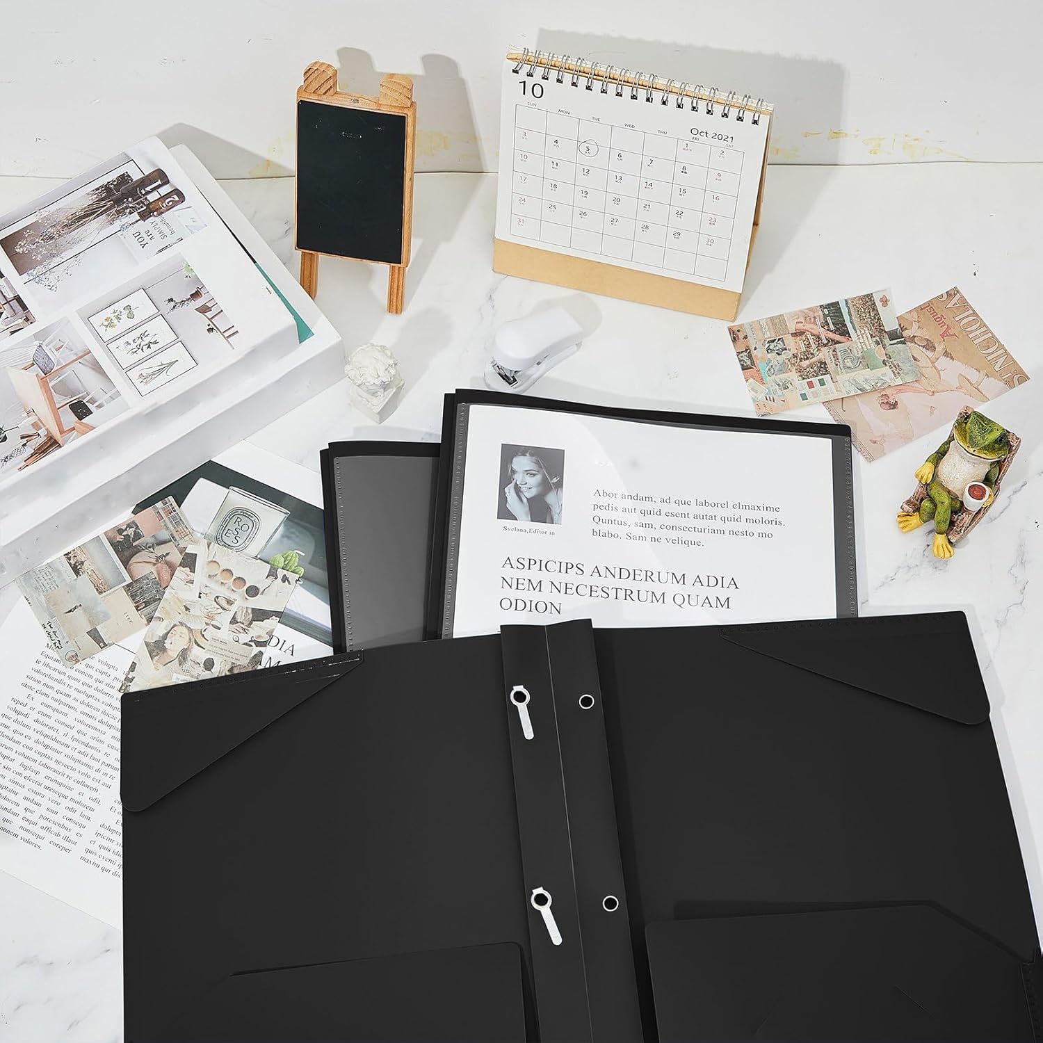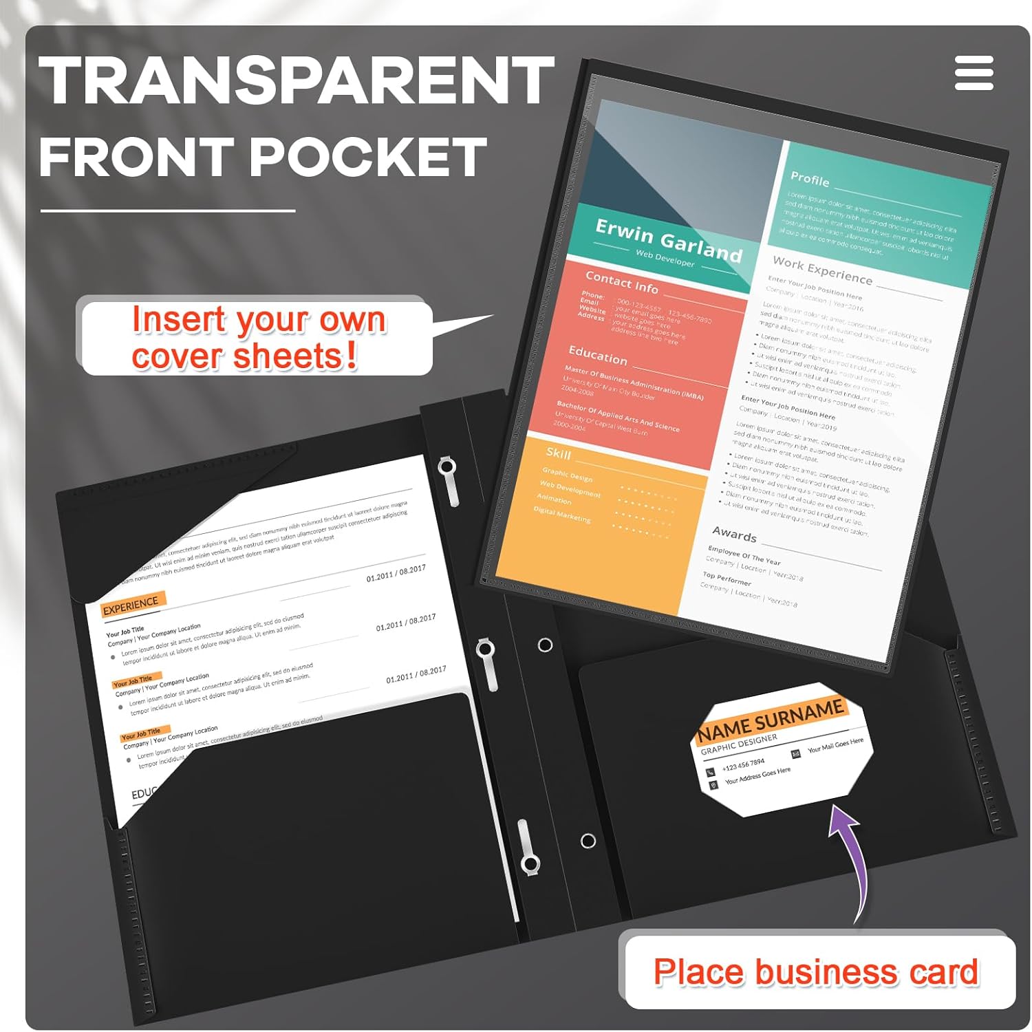 - Practical and Useful: with a clear front pocket, you can put your catalog, tables, favorite reports, presentations and more for clear display; Each plastic folder has 2 internal pockets to help organize and store your letter sized paper and documents; There are also 3 prongs to secure your 3-hole loose leaf paper in case it falls, and the card slot can hold your ID card or business card, practical for your daily work