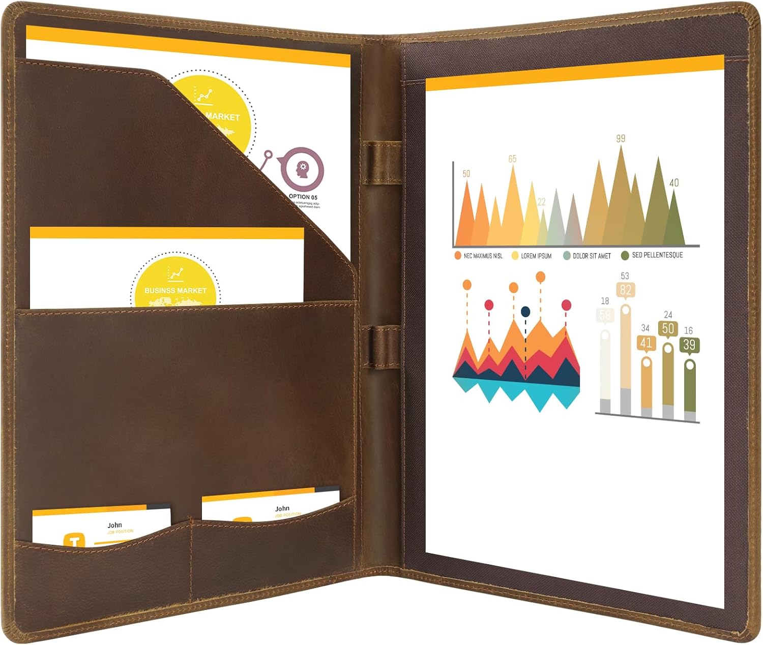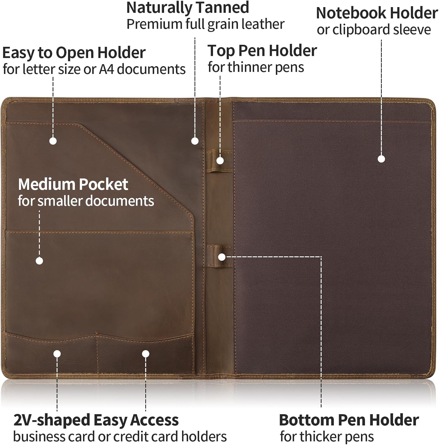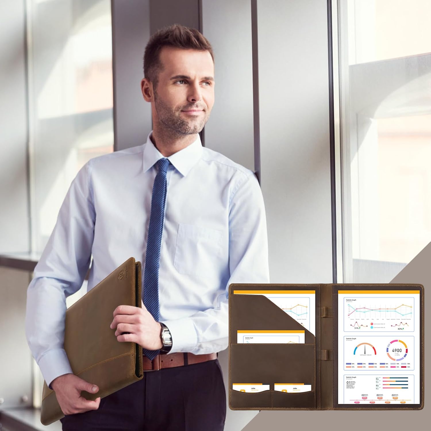 - 100% Premium Full Grain Leather: This leather portfolio is made of full grain leather, which is the highest- quality leather. It's more durable and rustic than PU leather. You can smell real leather.