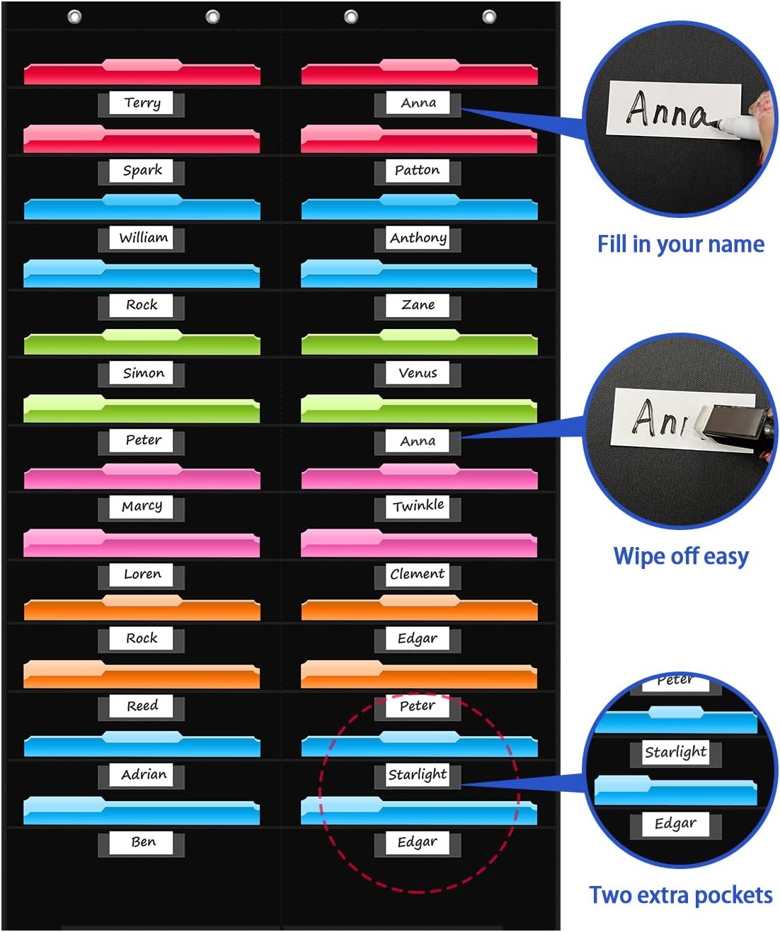 REGELETO 24 Pocket Storage Chart with Nametag Pockets, Hanging Wall File Organizer for Classroom and Office, Black