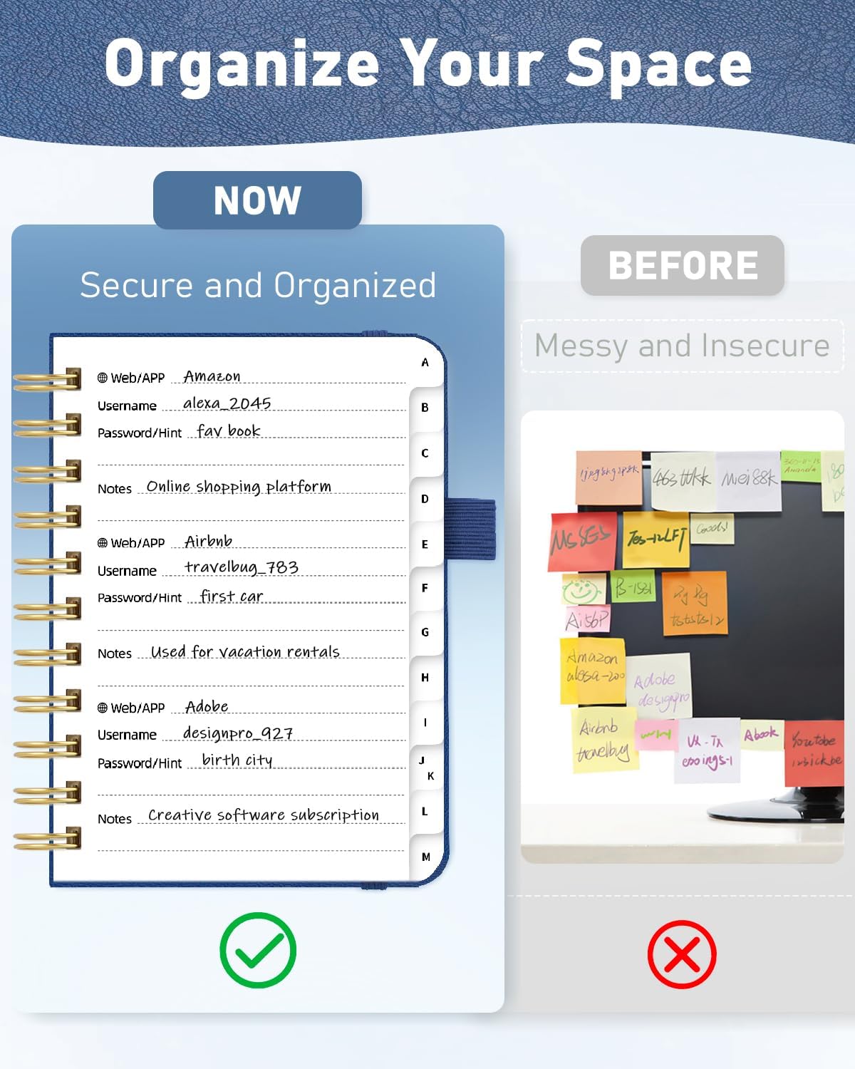 WEMATE Password Book with Alphabetical Tabs, Spiral Password Keeper Book for Seniors, Internet Password Notebook Password Journal Logbook Log in Detail, Small – 4.7''x 6'' (Navy Blue)
