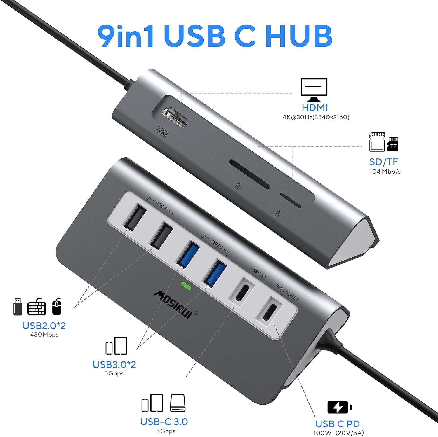 - SD/TF CARD READER:Mosirui USB C HUB multiple port has 104m/s SD/Micro SD card reader port. Fast viewing of your photos or videos, perfect for photographers, designers, or video editors. SD/TF reader can be work simultaneous.