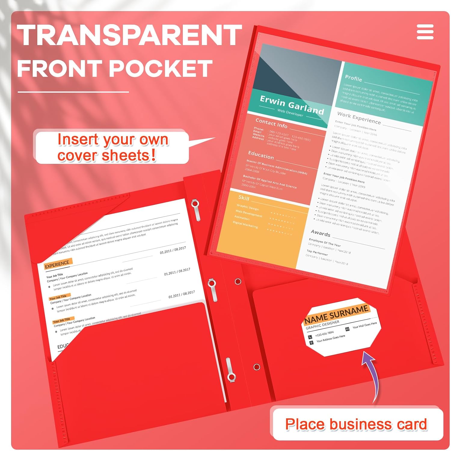 - Practical and Useful: with a clear front pocket, you can put your catalog, tables, favorite reports, presentations and more for clear display; Each plastic folder has 2 internal pockets to help organize and store your letter sized paper and documents; There are also 3 prongs to secure your 3-hole loose leaf paper in case it falls, and the card slot can hold your ID card or business card, practical for your daily work