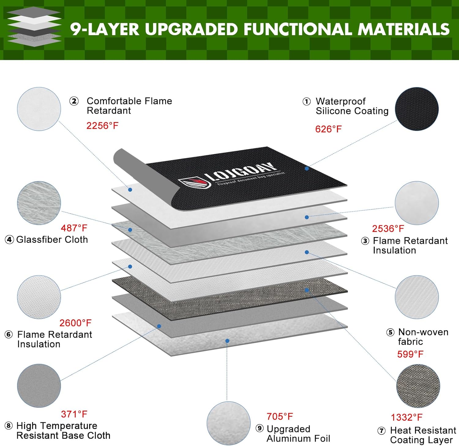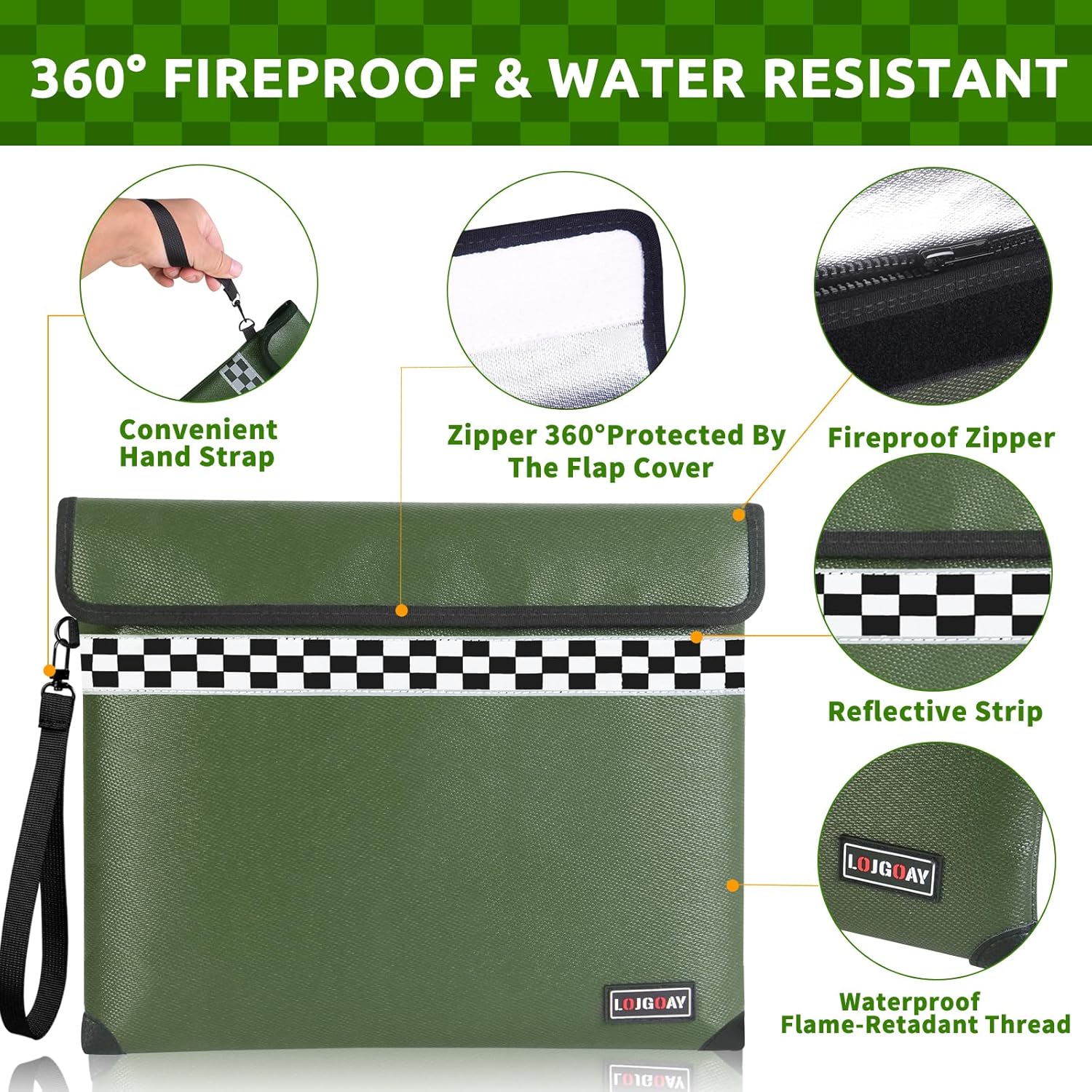 - 360° Fireproof and Double Safety Design: This LOJGARY fireproof bag not only upgrated to 9-layer function material structure of fire protection and heat insulated but also upgrated the zipper to professional fireproof and water resistant to make sure your valubles Double Safety; The fireproof money bag for cash is sewn with flame-retardant thread and fireproof hemming, to prevent fire from damaging the fireproof bag from the edge, it is closure by fireproof flap which make the fire proof money bag for cash 360°fire resistant.