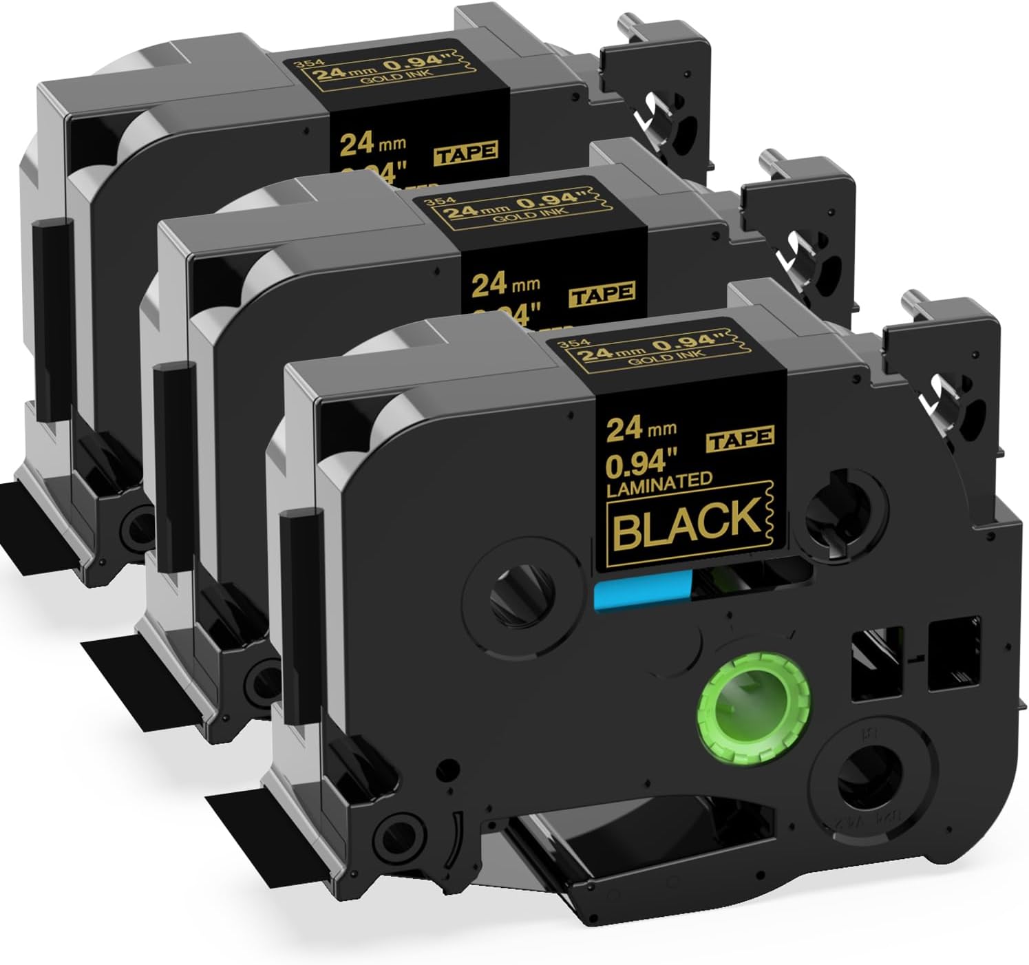 - 3-Pack compatible with brother p touch gold on black tape TZe-354 TZe354 24mm tze black tape. Color: Gold on Black. Width: 24mm (1") Length: 8m (26.2ft)