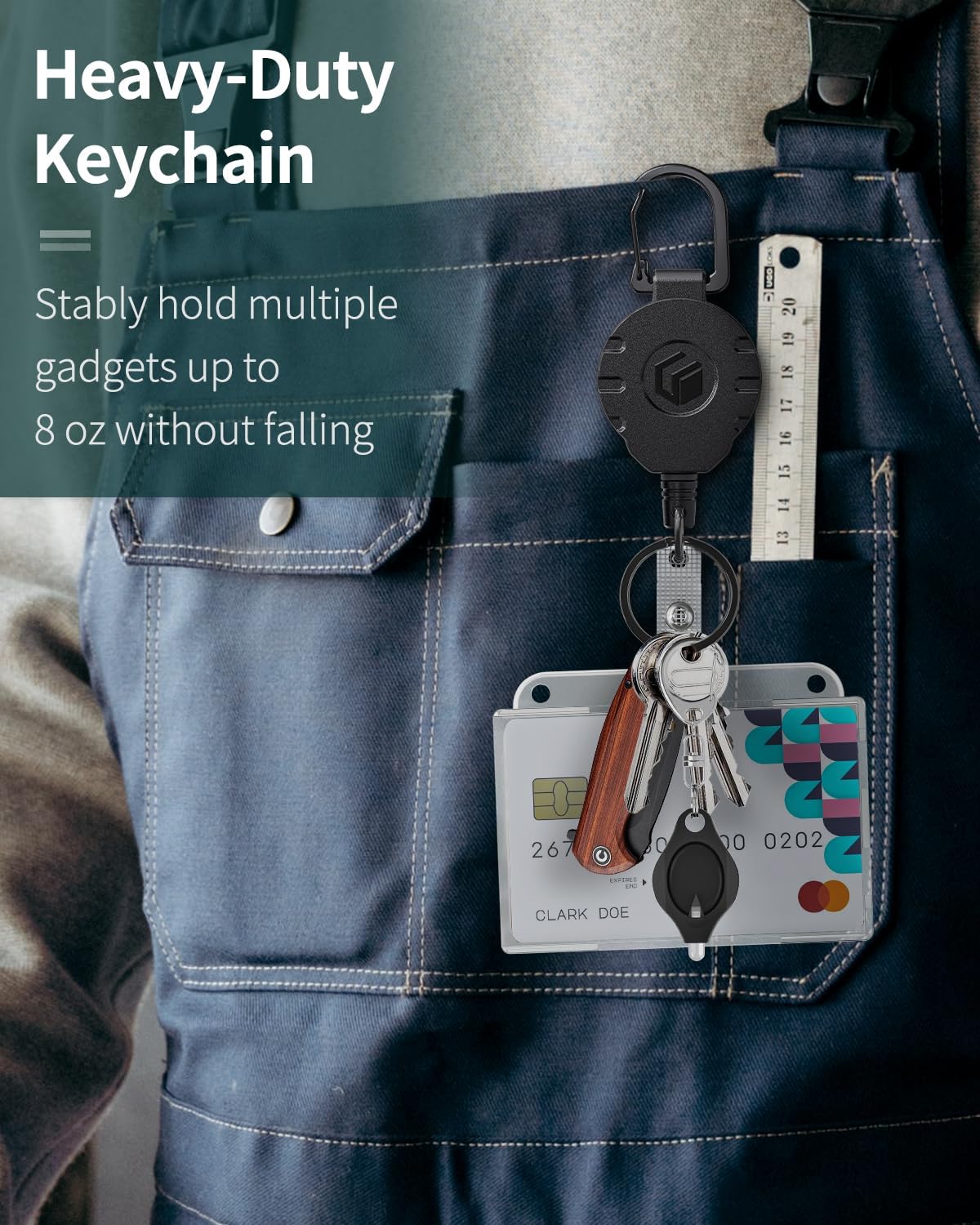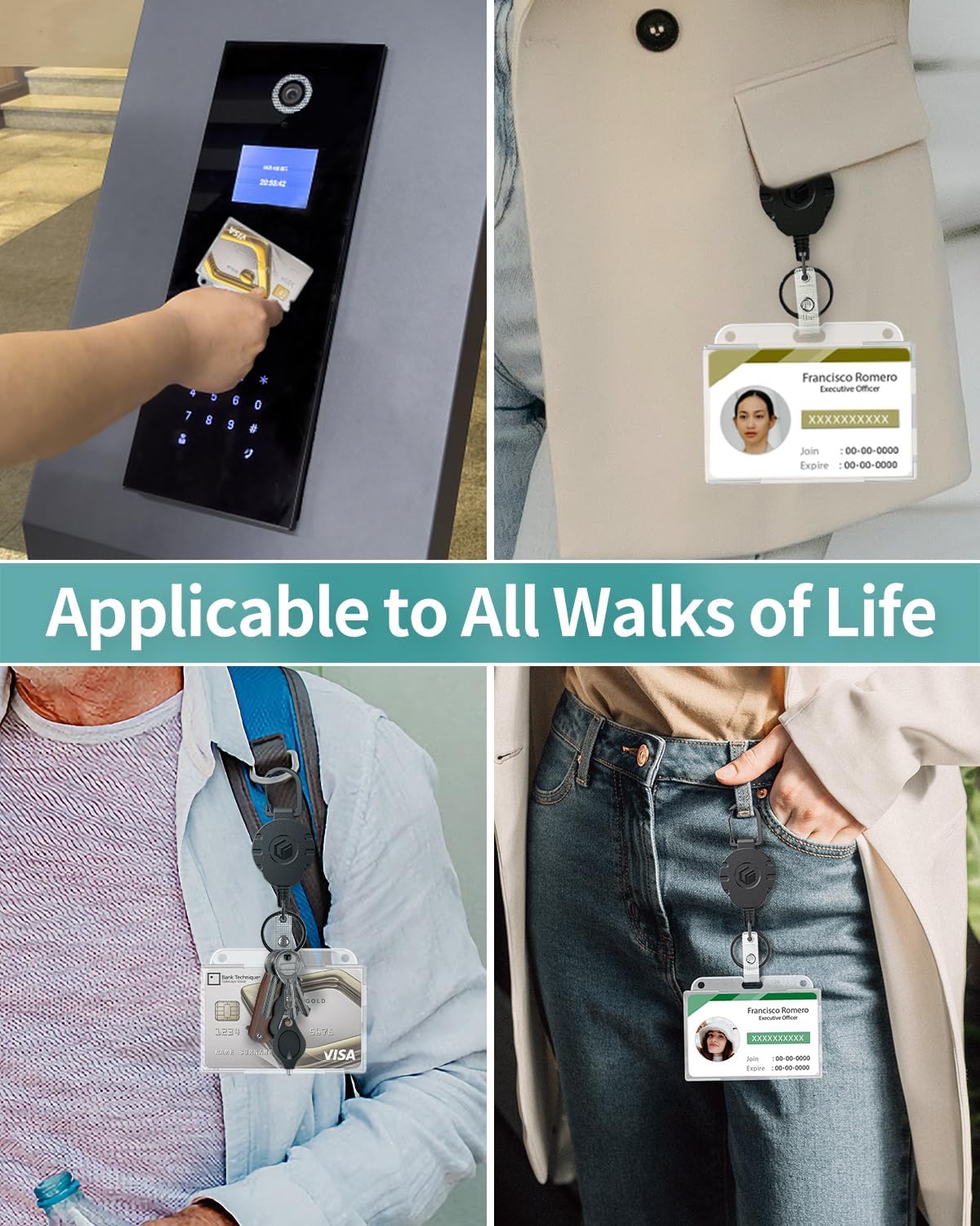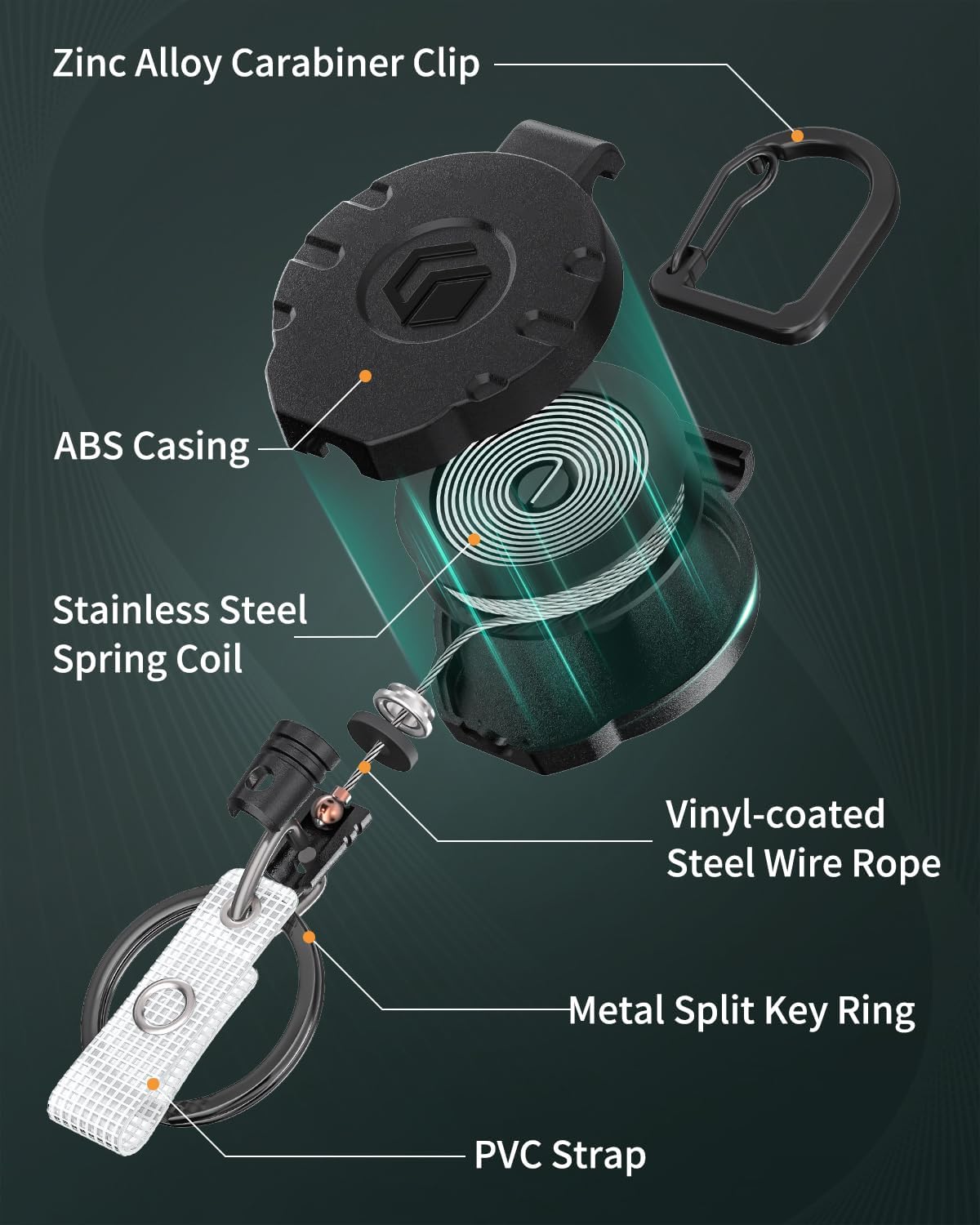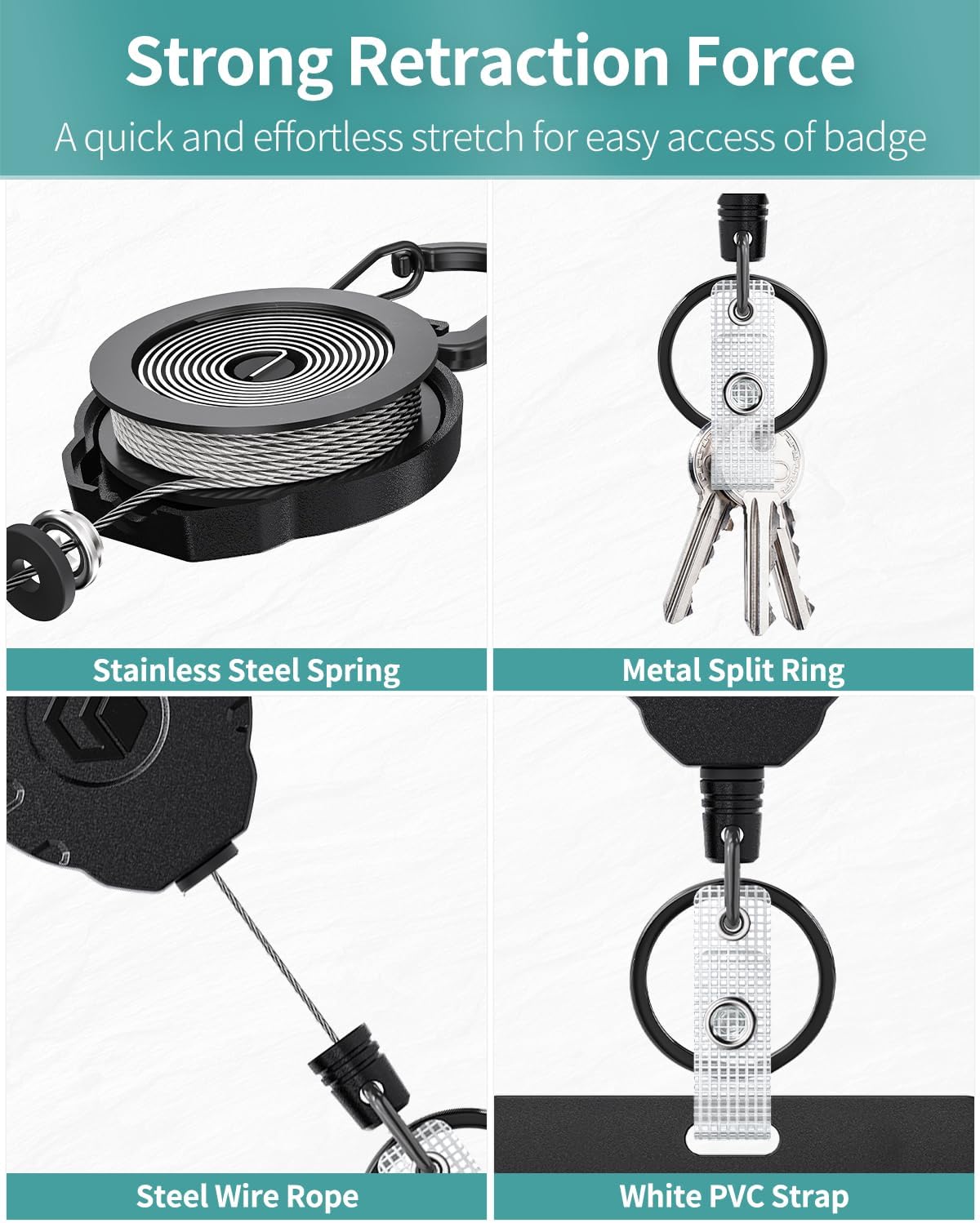 - Retractable Keychain: With built-in stainless steel spring coils, it has strong retraction force to endure pulls over 10,000 times and hold up to 8 oz. The 1 mm steel wire rope can stretch up to 31.5". Easy to open the door without removing the badge or key.