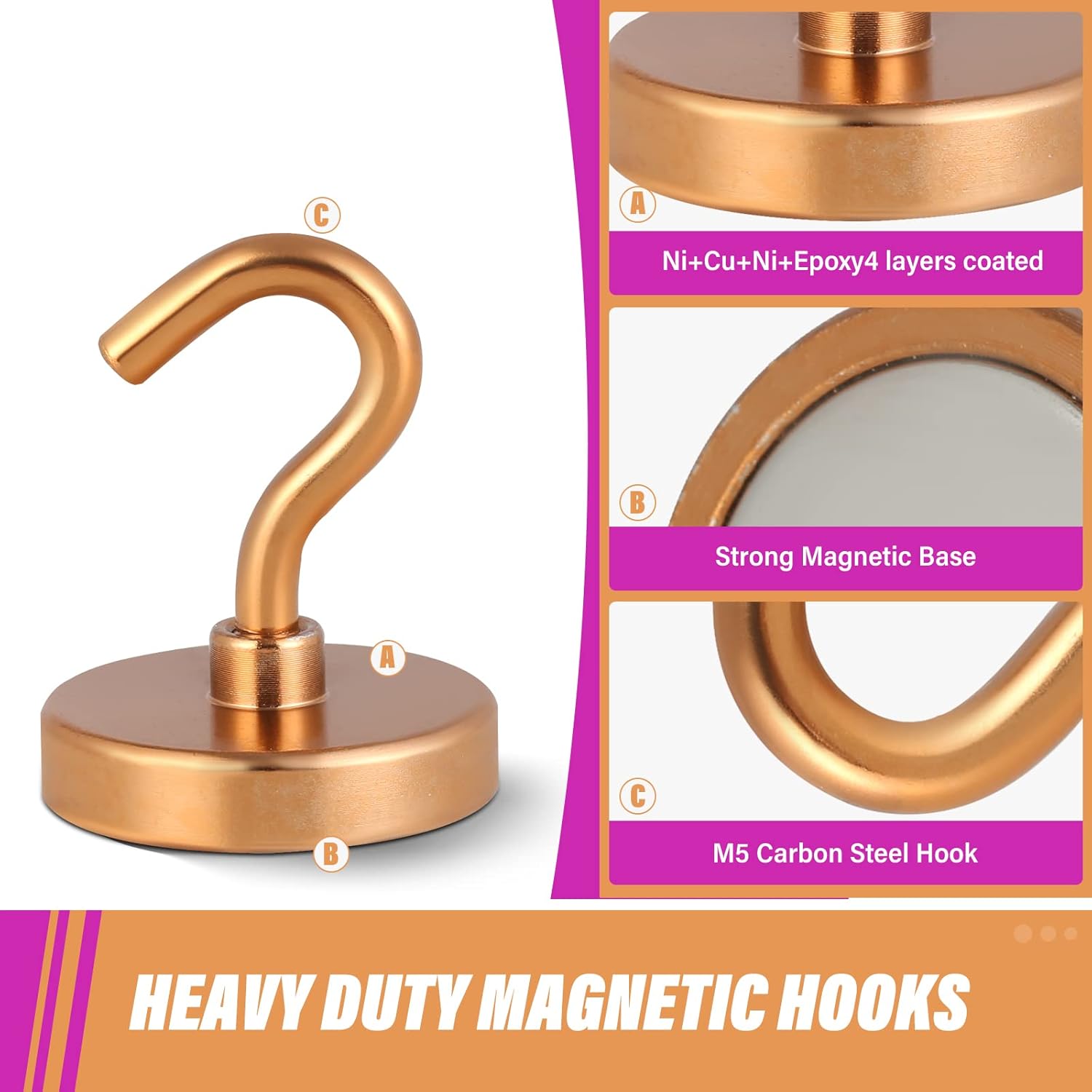 - ✔ HIGH-LEVEL PLATING- We offer 4 layers of coating on the magnet hook metal base, metal hook, and magnet. It provides this magnetic hanger with a shiny, rust-free, and mirror-like finish. Coated magnetic hook particularly exhibits an excellent anti-corrosive properties and scratch resistance. Maintenance-free, no rust!