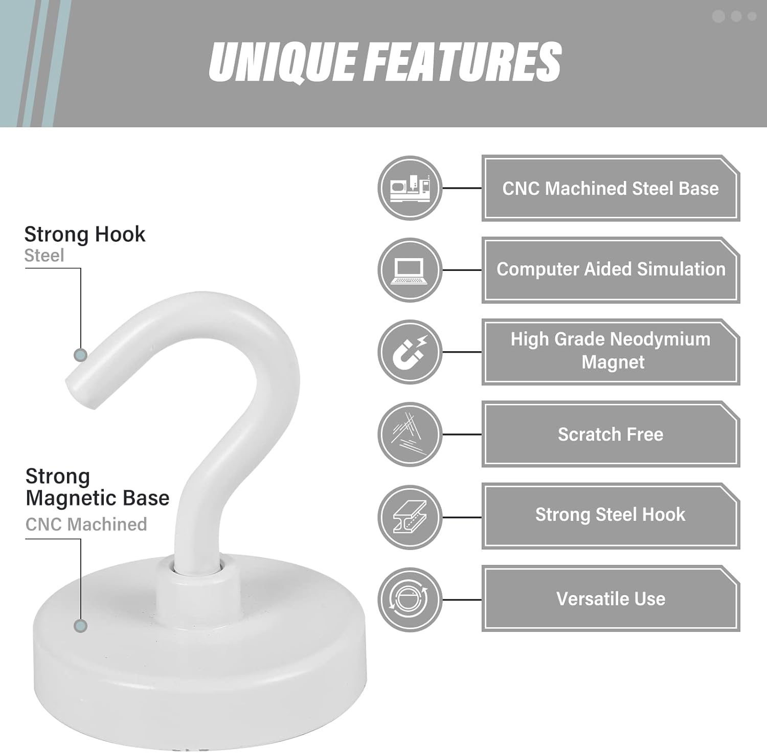 - ✔ VERSATILE USE- Neosmuk’s strong neodymium magnetic hooks were endowed with a strong capability for holding various items wherever there is iron or steel. This magnet hook is a perfect magnetic key holder. You can also hang your tools next to the toolbox with this magnetic hook. Our magnetic hooks are great for grill, pot, cup, utensils, and oven.
