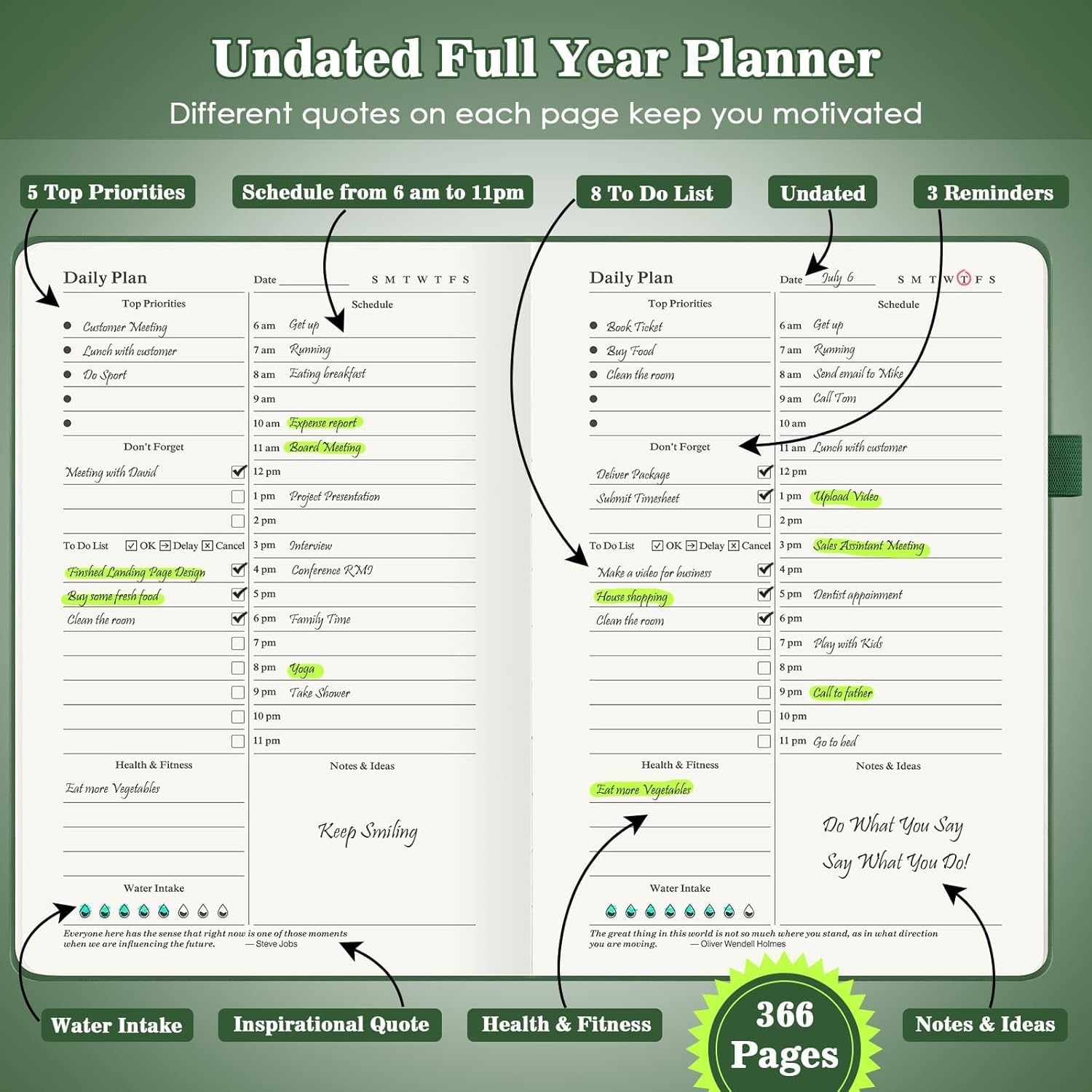 - 【Undated Yearly Planner】The 2024 daily planner is undated, making it easy to pick up without wasting a page. Each page split into 7 sections for 5 top priorities, 3 reminders, 8 to do list, a schedule from 6am to 11pm, water intake, health & fitness and notes & ideas. Break your day into hours and promotes a healthy work-life balance, help you stay organized.
