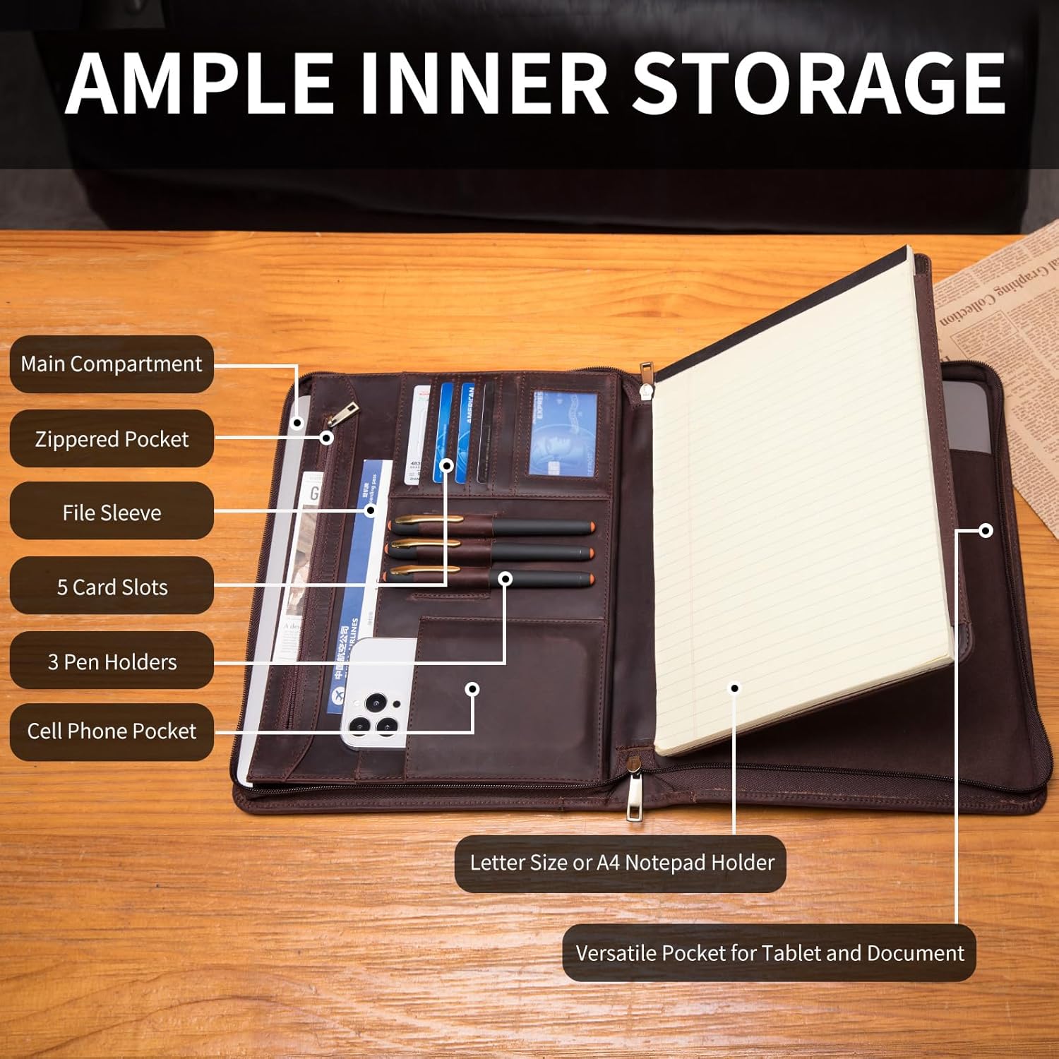 Genuine Leather Portfolio with Hidden Handle, Front Pocket, Business Padfolio Tablet/13” Laptop Organizer, Folio Document Cell Phone Holder, Professional Executive Folder, Dark Brown