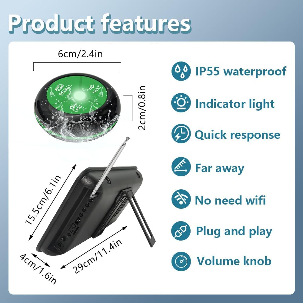 - NEXT Call Button: It is a waterproof signal transmitter for the service personnel to use. When the "NEXT" button is pressed, the number will automatically go to the next one. It makes our queue calling system simple and easy to use.
