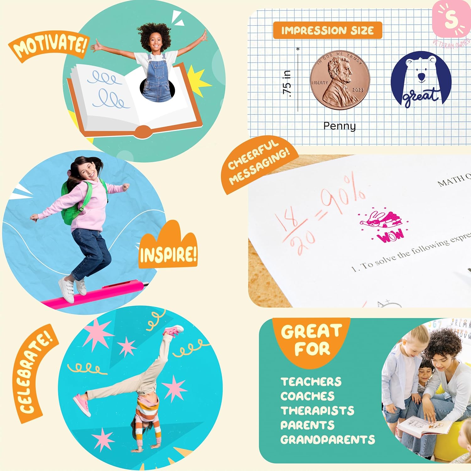 - Pre-inked Flash Stamps – Cute high quality, beautiful, vibrant, and fun stamps: Eggcellent, great, WOW, You can do amazing things, please CORRECT & RETURN, Shine like the stars